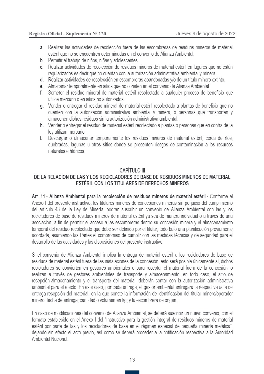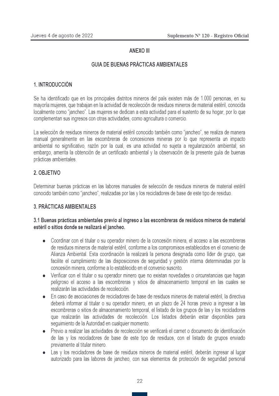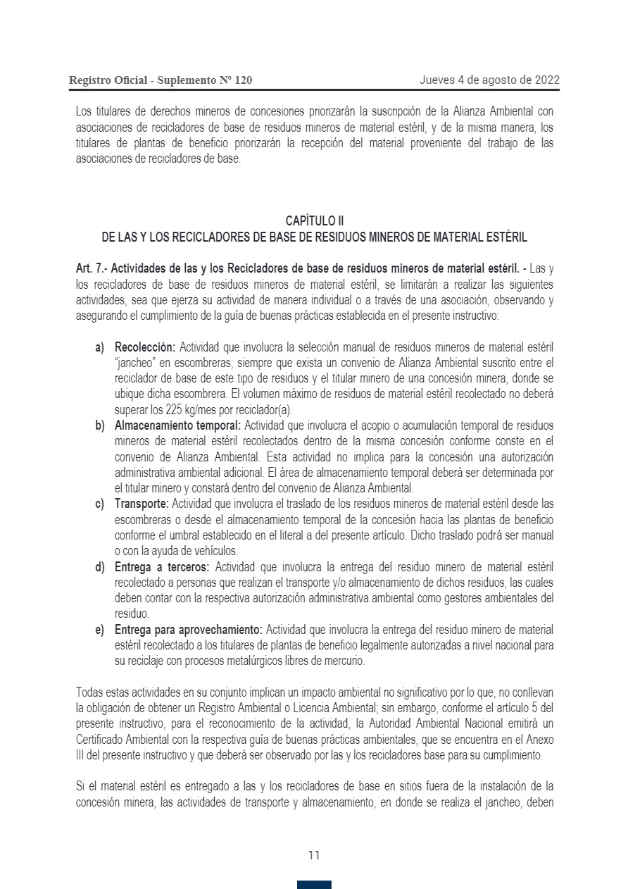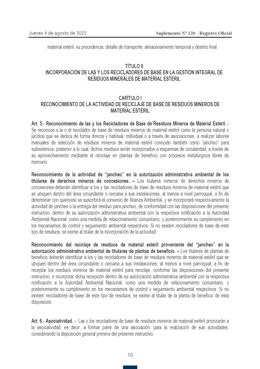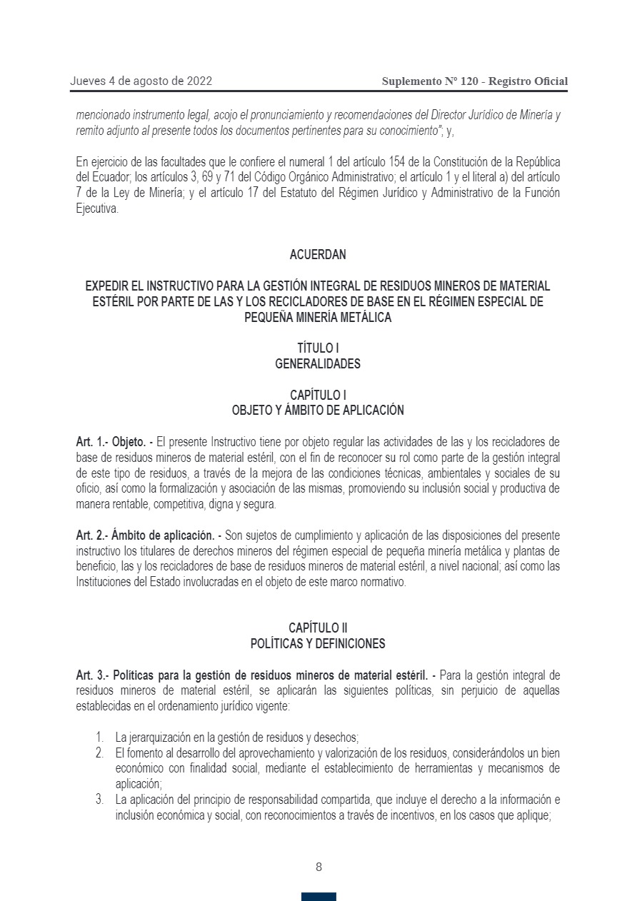 El acuerdo Interministerial No. MAATE-MEM-2022-001 presenta el Instructivo destinado a regular la gestión de residuos mineros de material estéril llevada a cabo por los recicladores de base en el ámbito de la pequeña minería metálica. El objetivo principal del Instructivo es mejorar las condiciones técnicas, ambientales y sociales relacionadas con las actividades de los recicladores. Asimismo, busca otorgar reconocimiento a su función esencial en la gestión integral de estos residuos, fomentar su formalización y asociación en grupos, y promover su inclusión social y productiva de manera segura, rentable y digna.