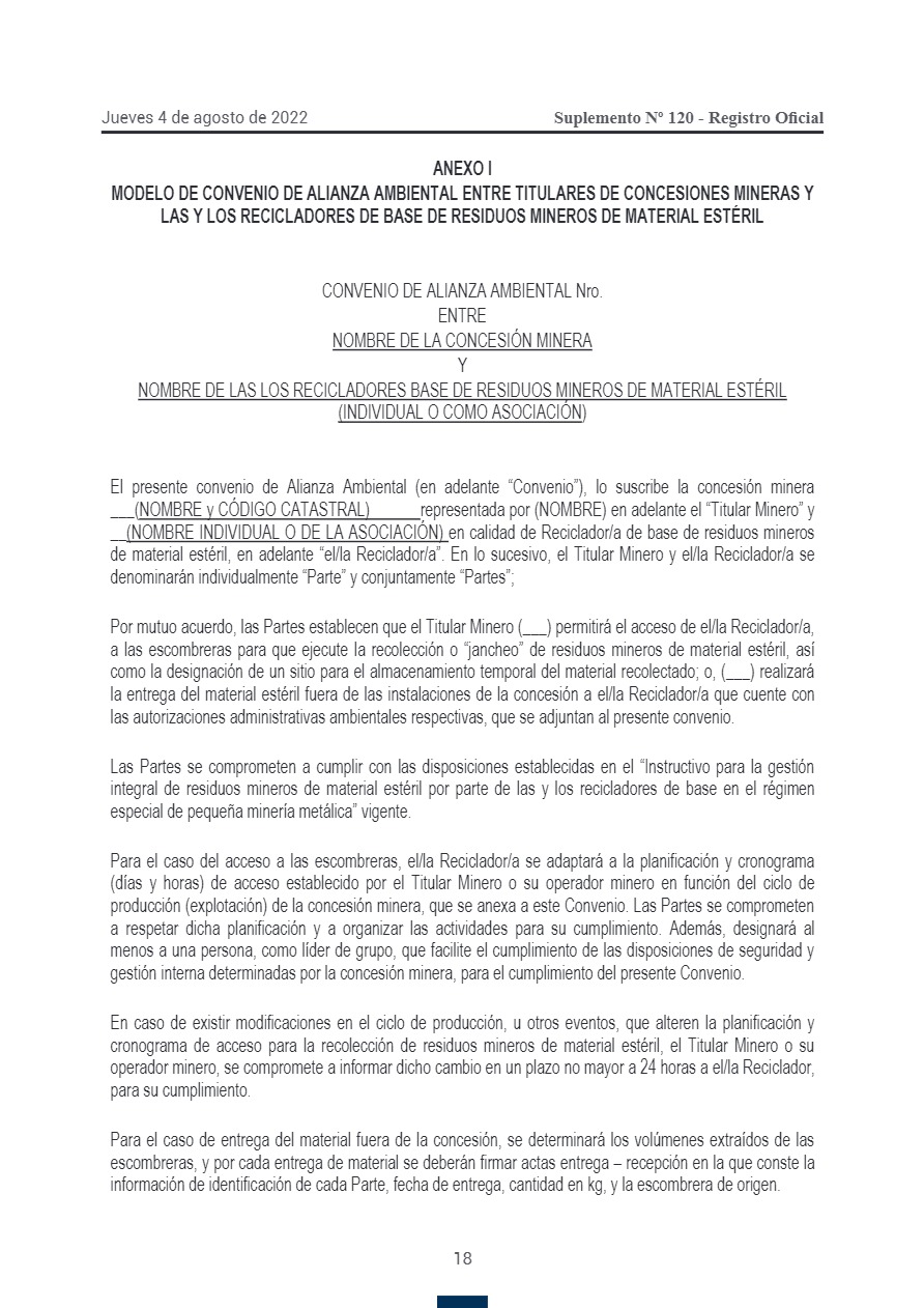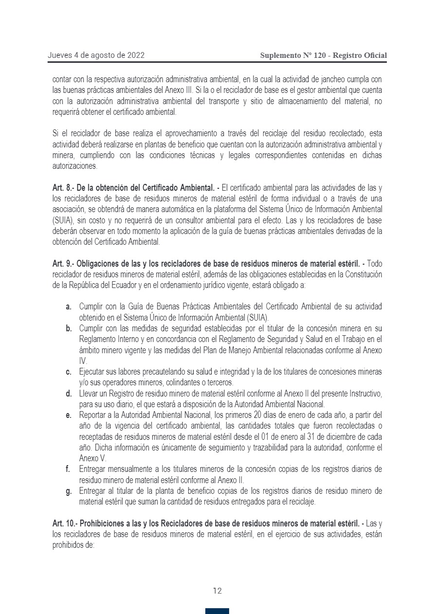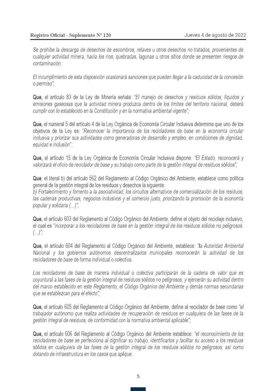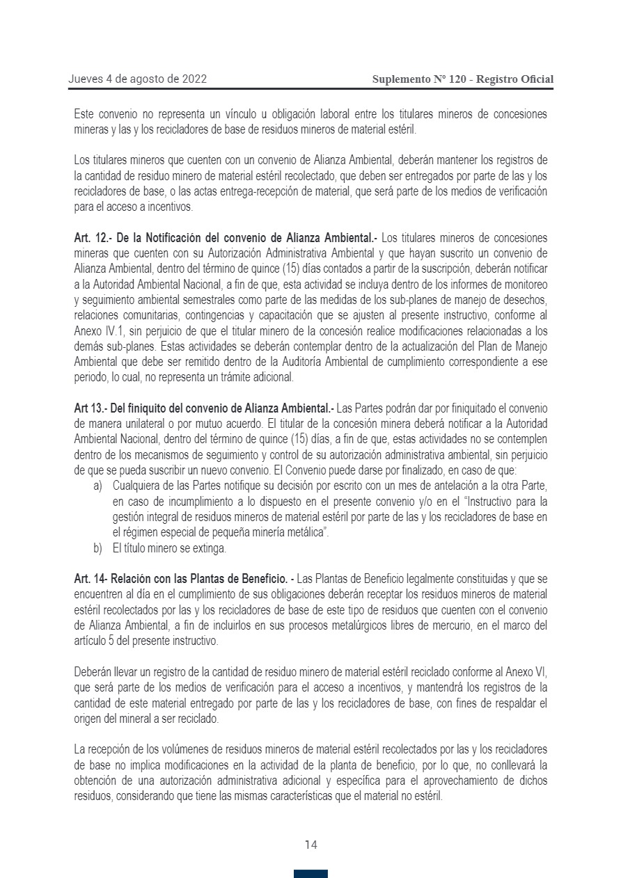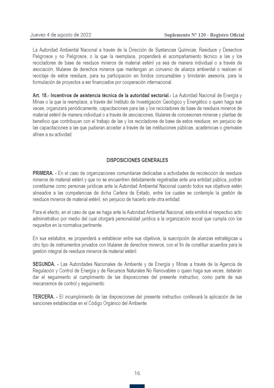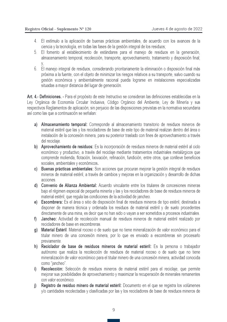 El acuerdo Interministerial No. MAATE-MEM-2022-001 presenta el Instructivo destinado a regular la gestión de residuos mineros de material estéril llevada a cabo por los recicladores de base en el ámbito de la pequeña minería metálica. El objetivo principal del Instructivo es mejorar las condiciones técnicas, ambientales y sociales relacionadas con las actividades de los recicladores. Asimismo, busca otorgar reconocimiento a su función esencial en la gestión integral de estos residuos, fomentar su formalización y asociación en grupos, y promover su inclusión social y productiva de manera segura, rentable y digna.