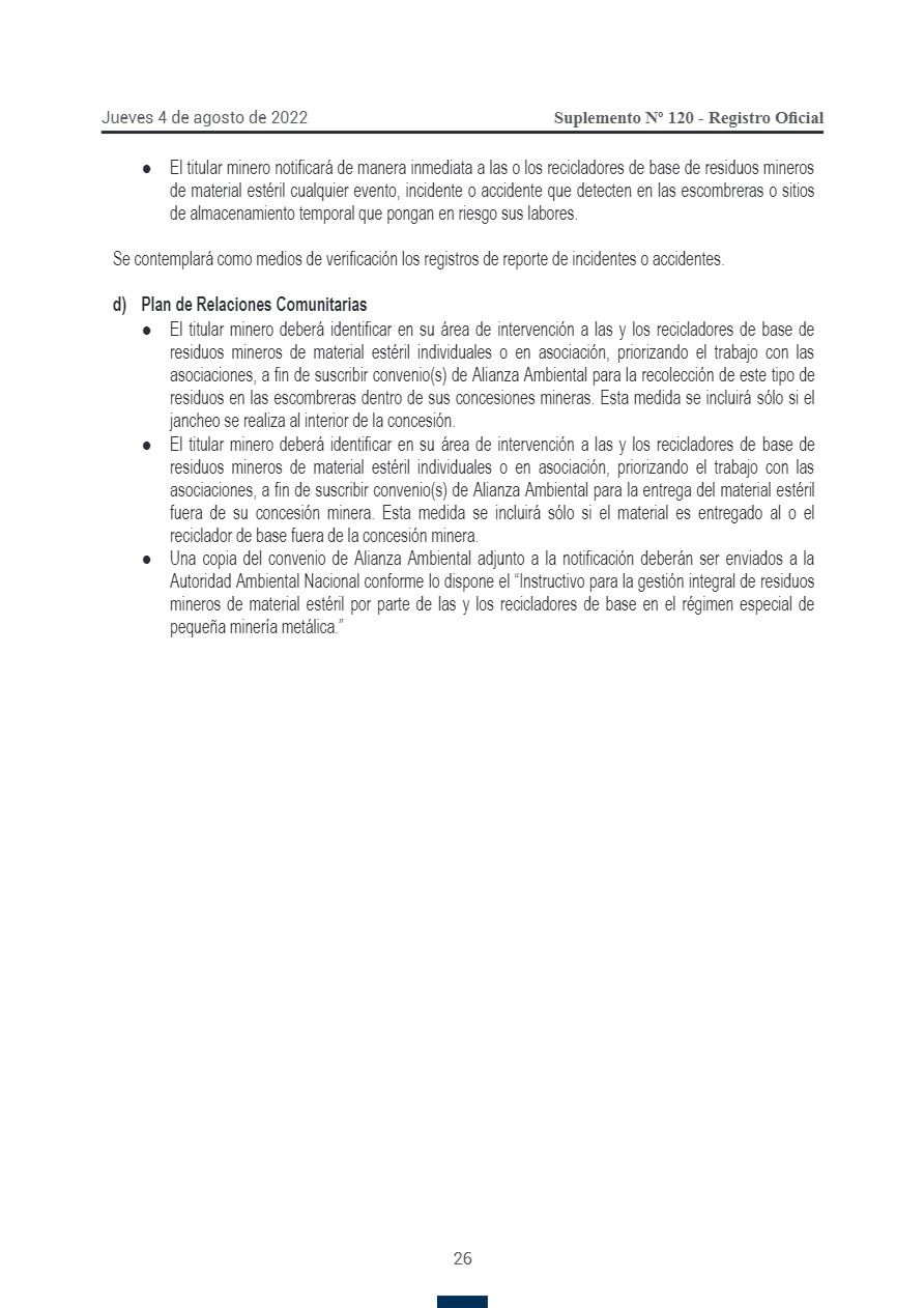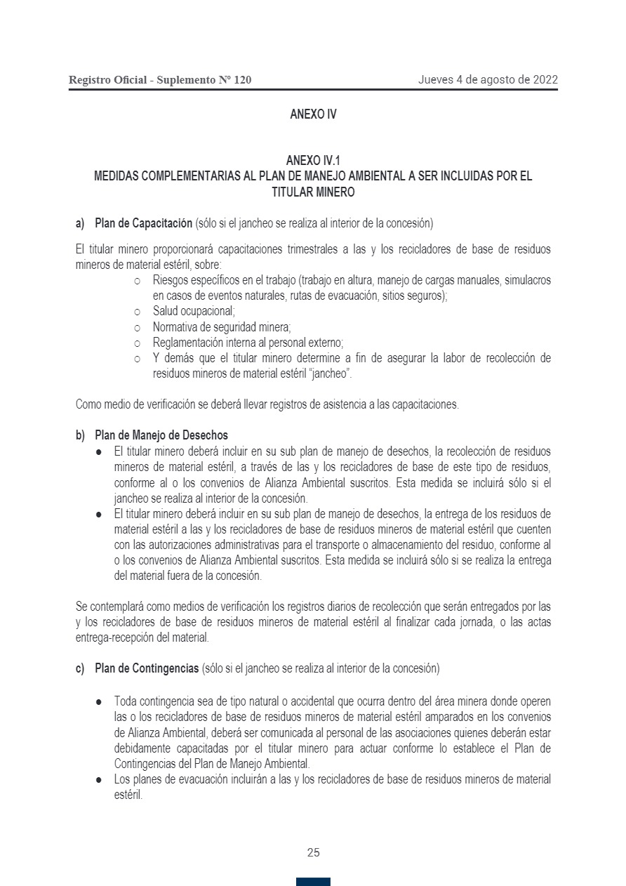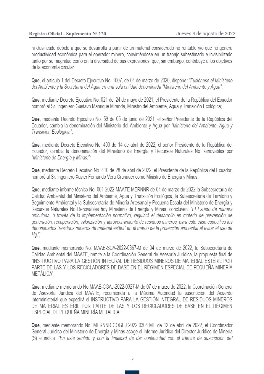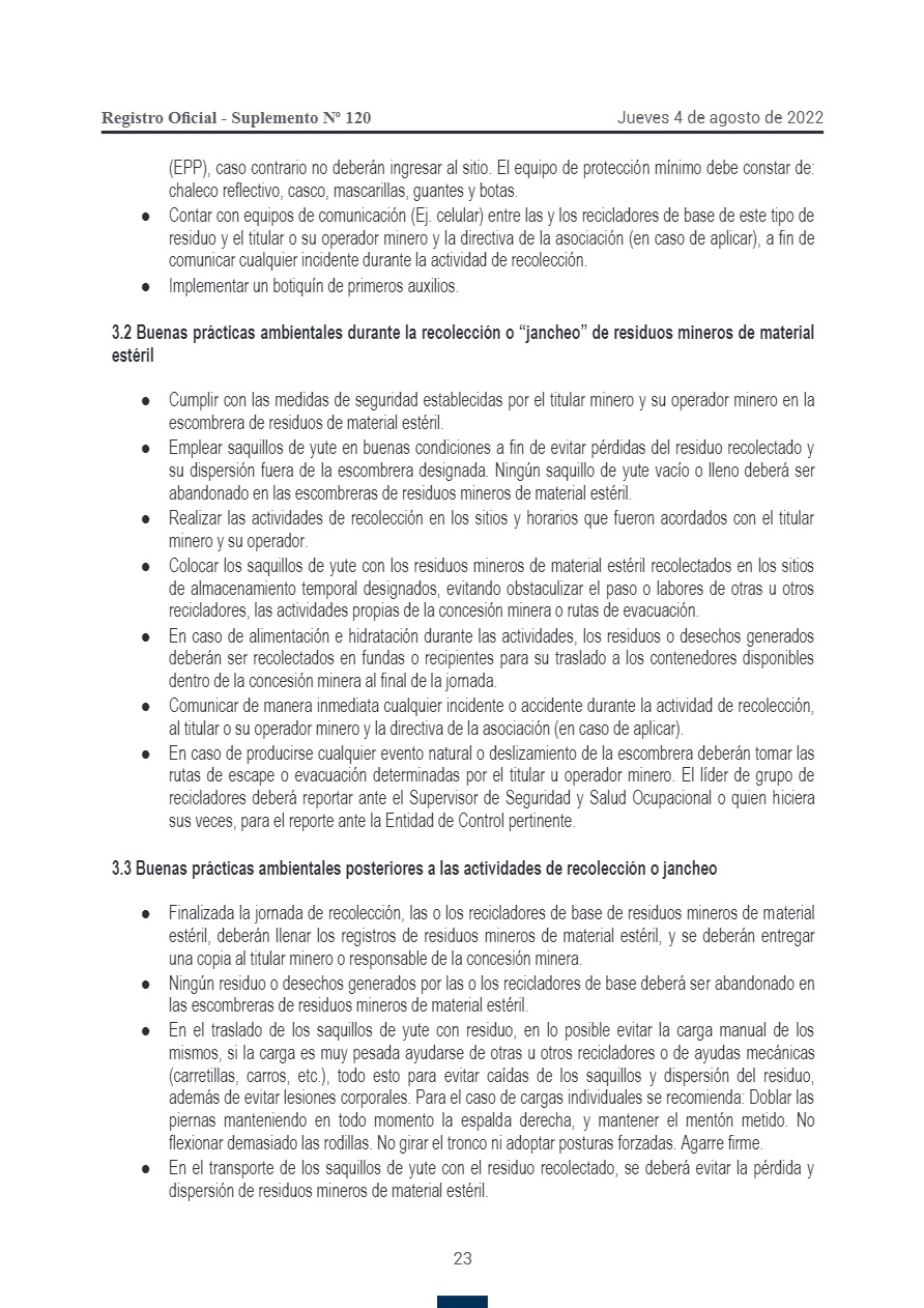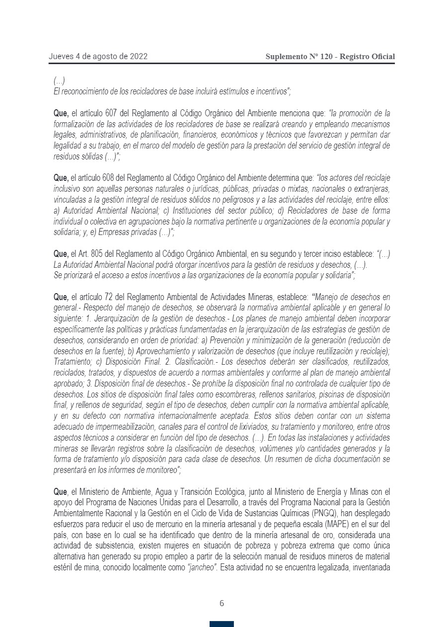 El acuerdo Interministerial No. MAATE-MEM-2022-001 presenta el Instructivo destinado a regular la gestión de residuos mineros de material estéril llevada a cabo por los recicladores de base en el ámbito de la pequeña minería metálica. El objetivo principal del Instructivo es mejorar las condiciones técnicas, ambientales y sociales relacionadas con las actividades de los recicladores. Asimismo, busca otorgar reconocimiento a su función esencial en la gestión integral de estos residuos, fomentar su formalización y asociación en grupos, y promover su inclusión social y productiva de manera segura, rentable y digna.