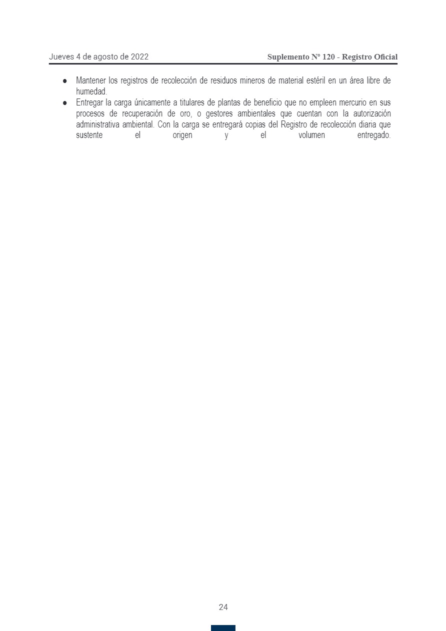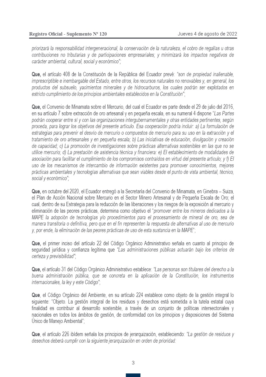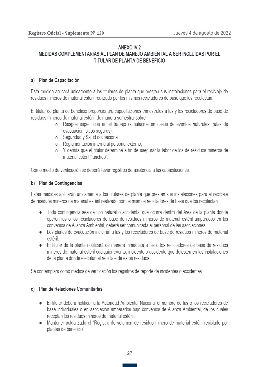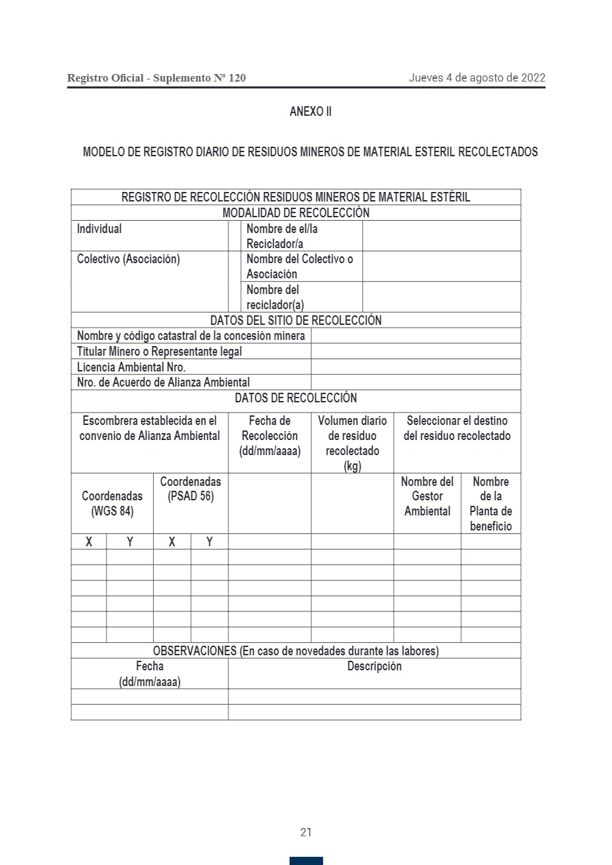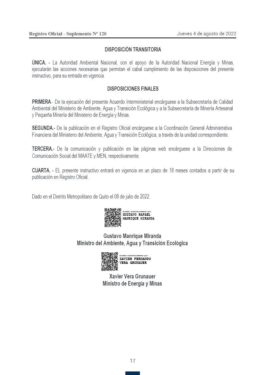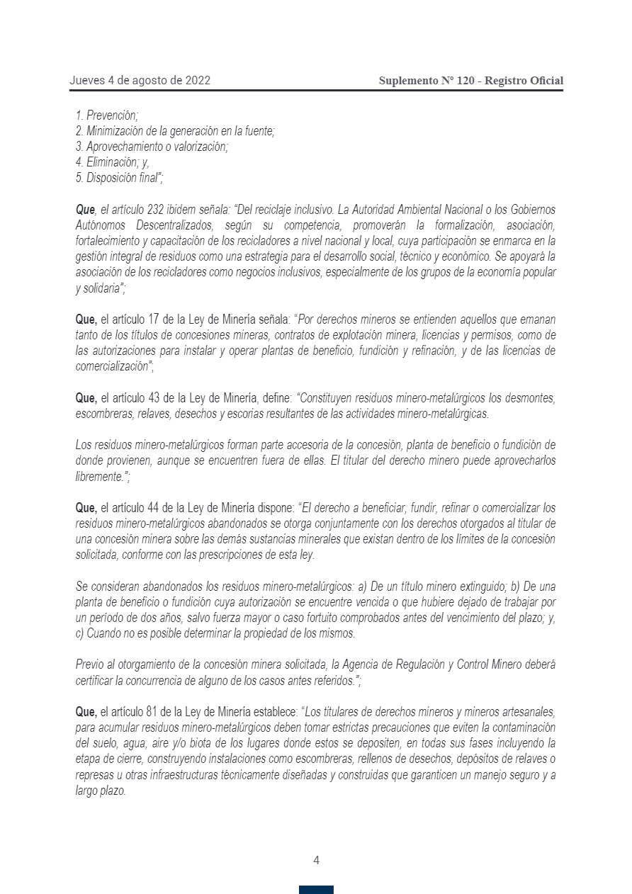El acuerdo Interministerial No. MAATE-MEM-2022-001 presenta el Instructivo destinado a regular la gestión de residuos mineros de material estéril llevada a cabo por los recicladores de base en el ámbito de la pequeña minería metálica. El objetivo principal del Instructivo es mejorar las condiciones técnicas, ambientales y sociales relacionadas con las actividades de los recicladores. Asimismo, busca otorgar reconocimiento a su función esencial en la gestión integral de estos residuos, fomentar su formalización y asociación en grupos, y promover su inclusión social y productiva de manera segura, rentable y digna.