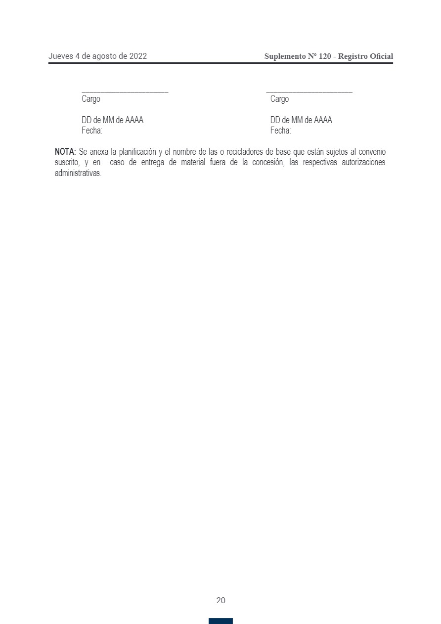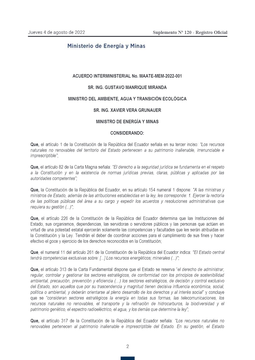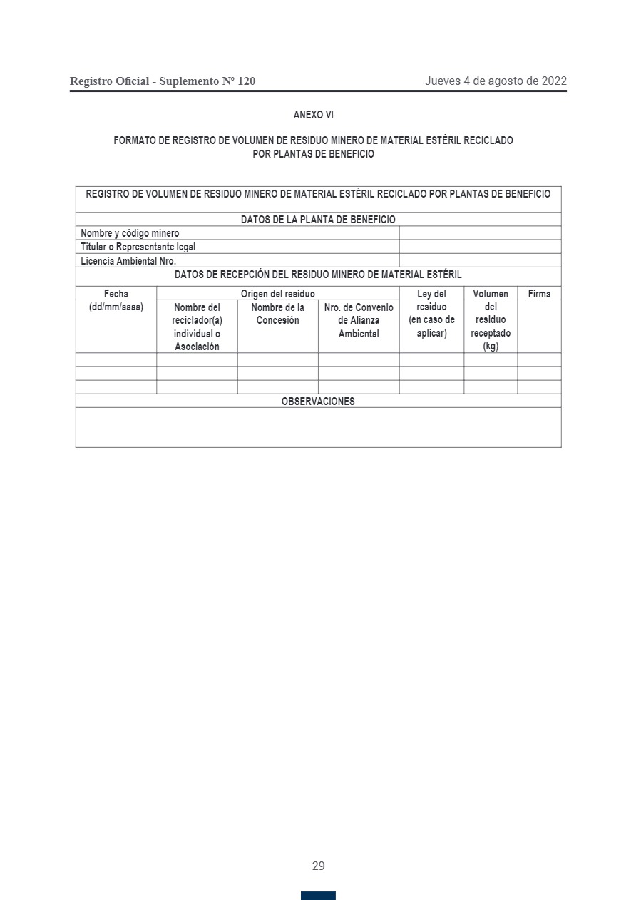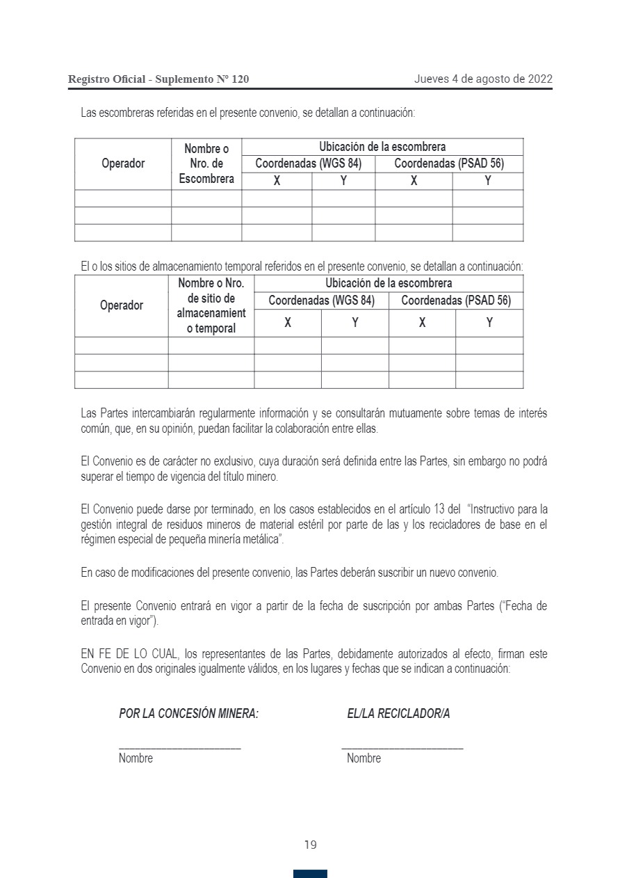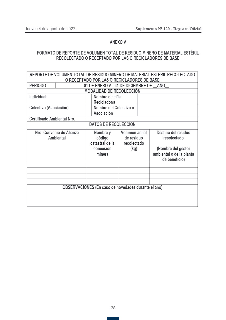El acuerdo Interministerial No. MAATE-MEM-2022-001 presenta el Instructivo destinado a regular la gestión de residuos mineros de material estéril llevada a cabo por los recicladores de base en el ámbito de la pequeña minería metálica. El objetivo principal del Instructivo es mejorar las condiciones técnicas, ambientales y sociales relacionadas con las actividades de los recicladores. Asimismo, busca otorgar reconocimiento a su función esencial en la gestión integral de estos residuos, fomentar su formalización y asociación en grupos, y promover su inclusión social y productiva de manera segura, rentable y digna.