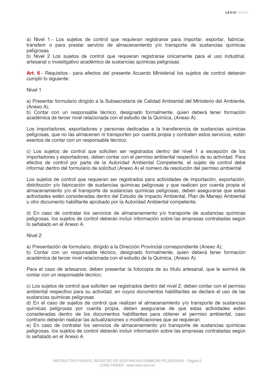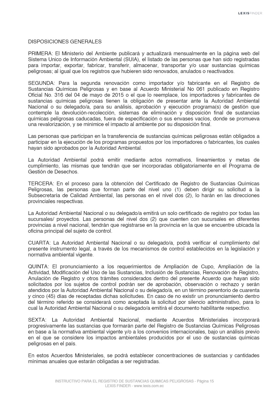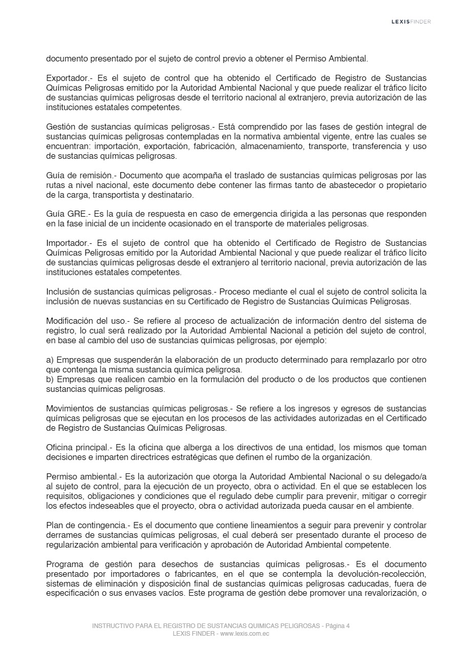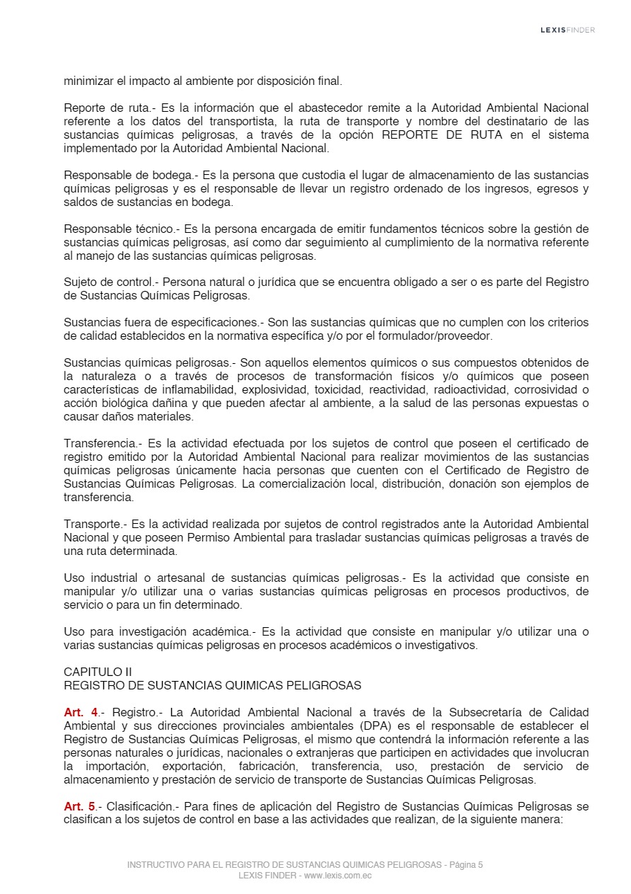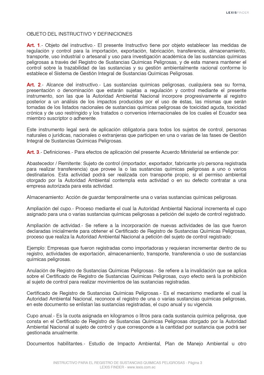 Las sustancias químicas peligrosas, cualquiera sea su forma, presentación o denominación que estarán sujetas a regulación y control mediante el presente instrumento, son las que la Autoridad Ambiental Nacional incorpore progresivamente al registro posterior a un análisis de los impactos producidos por el uso de éstas, las mismas que serán tomadas de los listados nacionales de sustancias químicas peligrosas de toxicidad aguda, toxicidad crónica y de uso restringido y los tratados o convenios internacionales de los cuales el Ecuador sea miembro suscriptor o adherente.