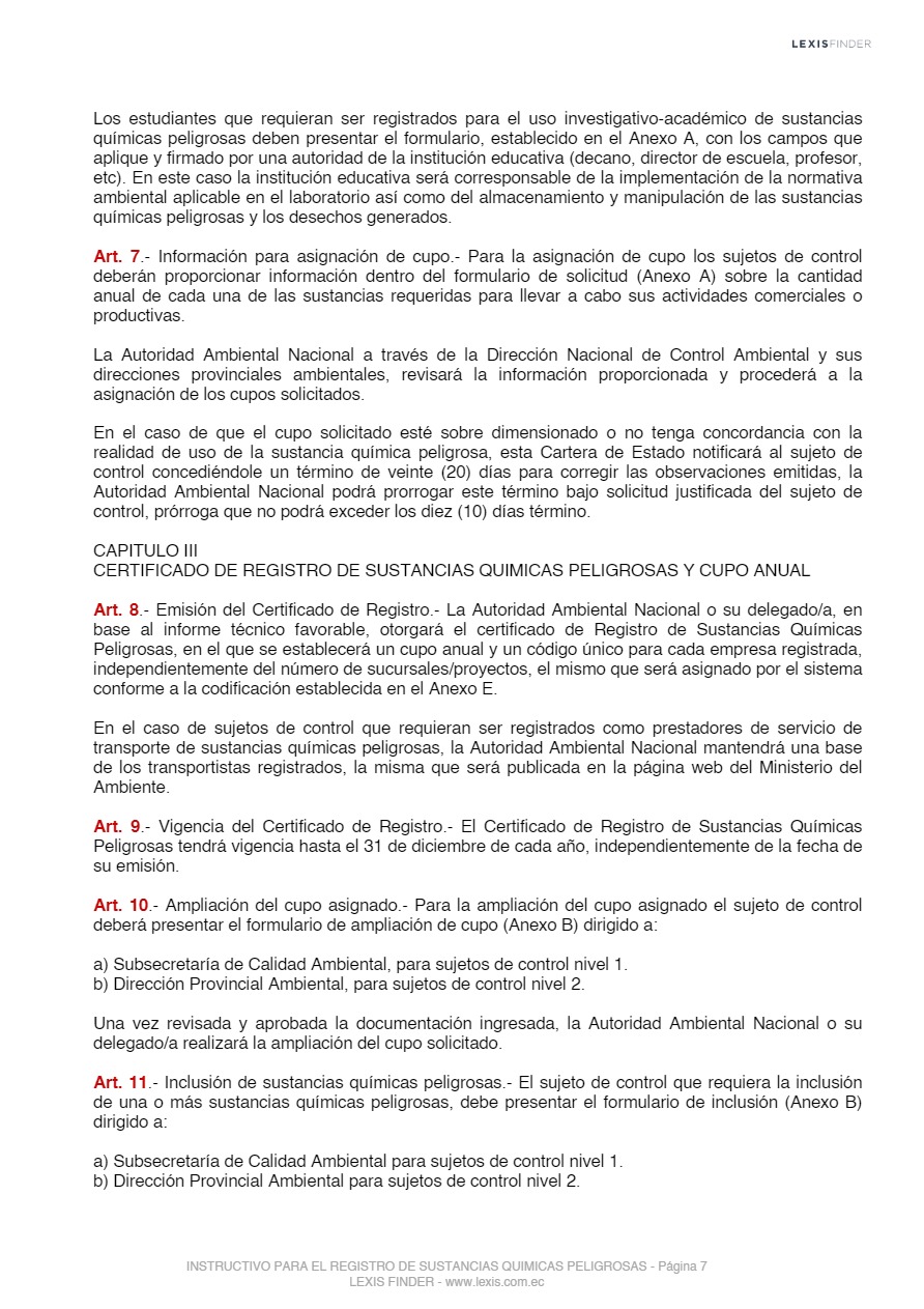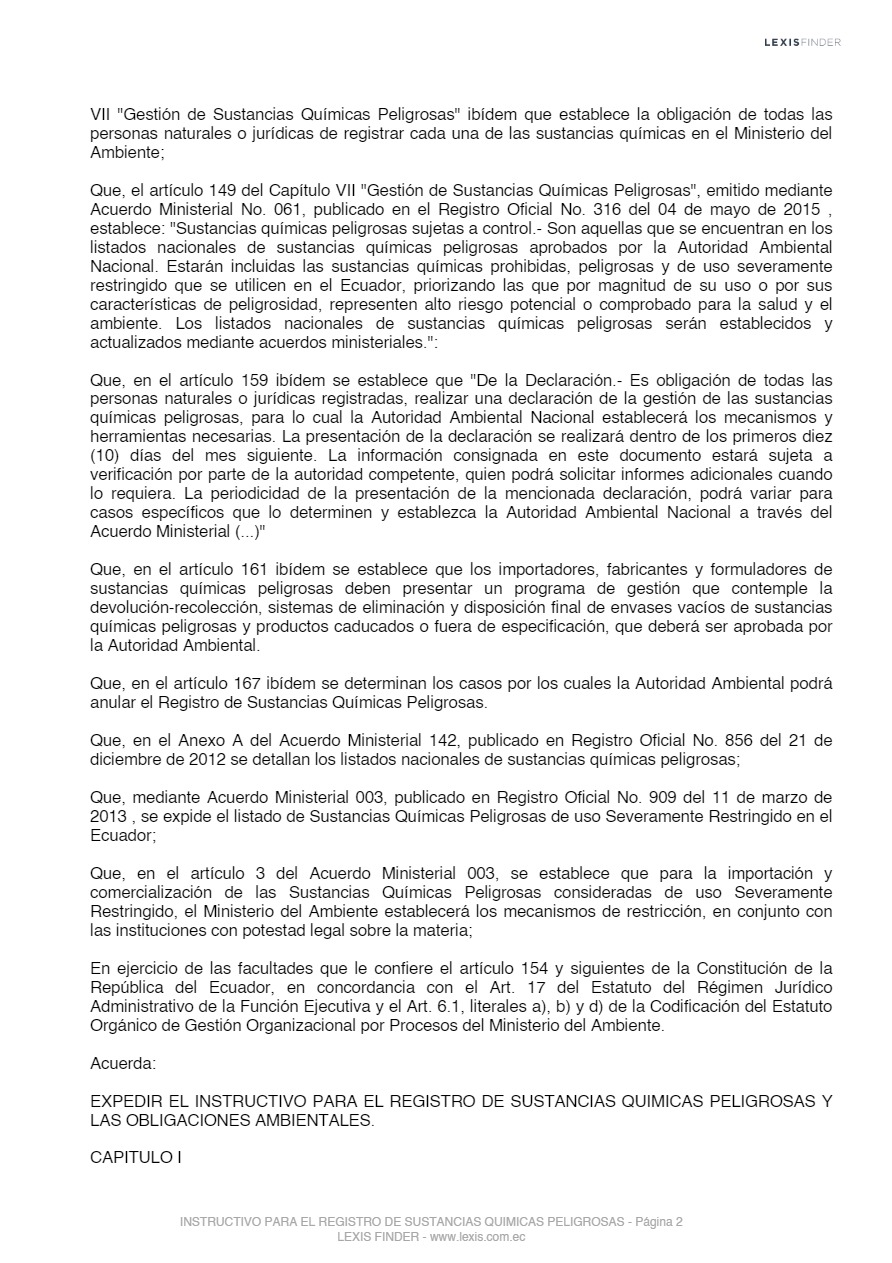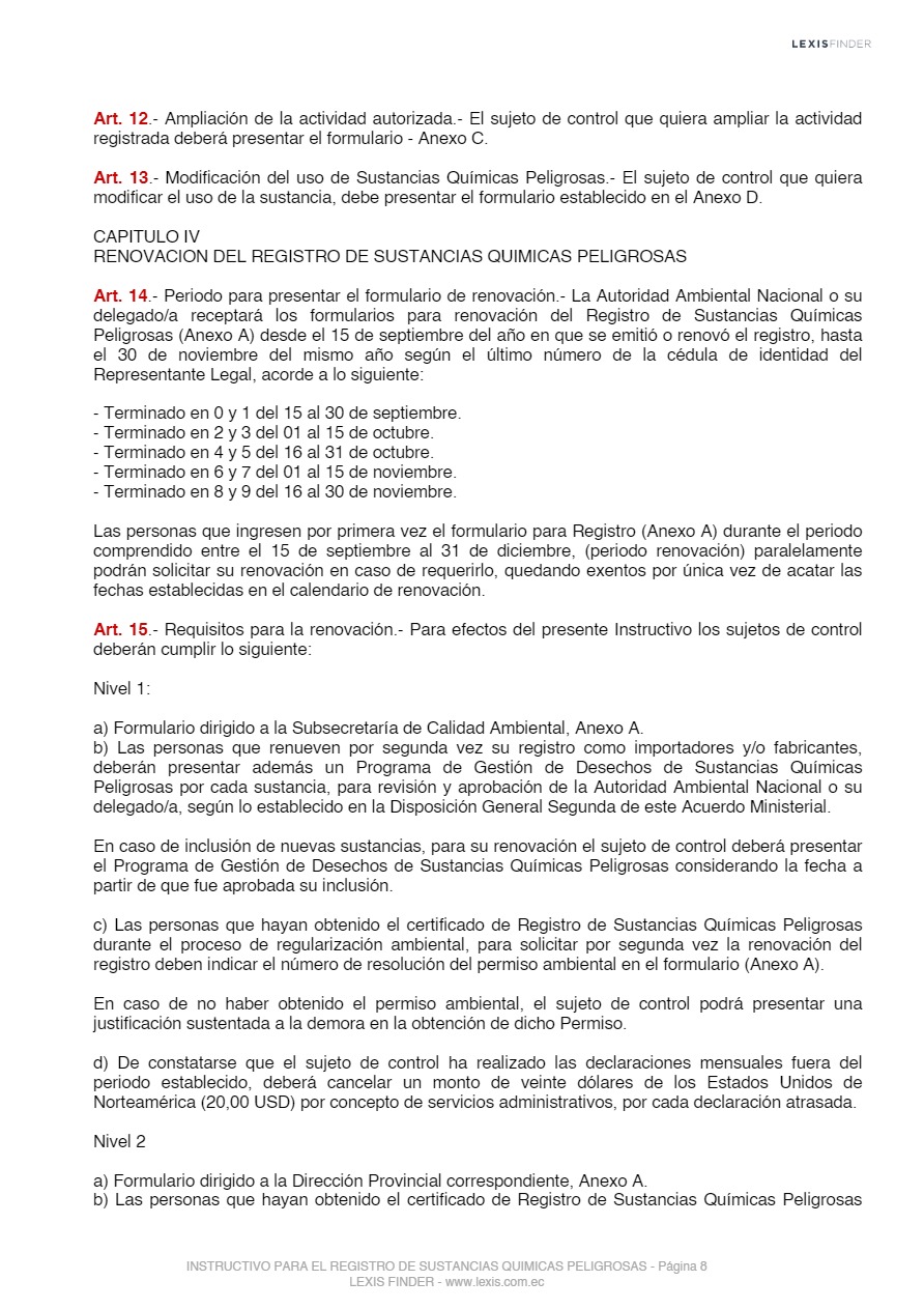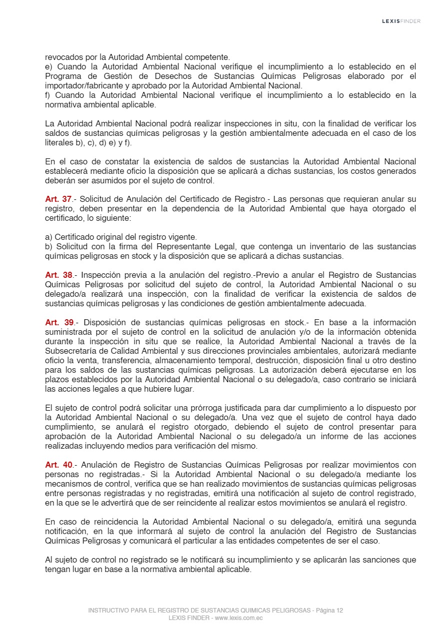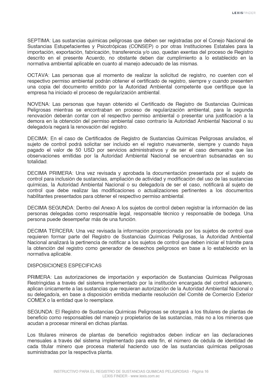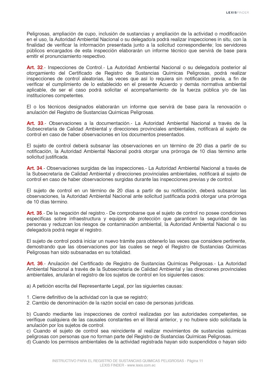 Las sustancias químicas peligrosas, cualquiera sea su forma, presentación o denominación que estarán sujetas a regulación y control mediante el presente instrumento, son las que la Autoridad Ambiental Nacional incorpore progresivamente al registro posterior a un análisis de los impactos producidos por el uso de éstas, las mismas que serán tomadas de los listados nacionales de sustancias químicas peligrosas de toxicidad aguda, toxicidad crónica y de uso restringido y los tratados o convenios internacionales de los cuales el Ecuador sea miembro suscriptor o adherente.