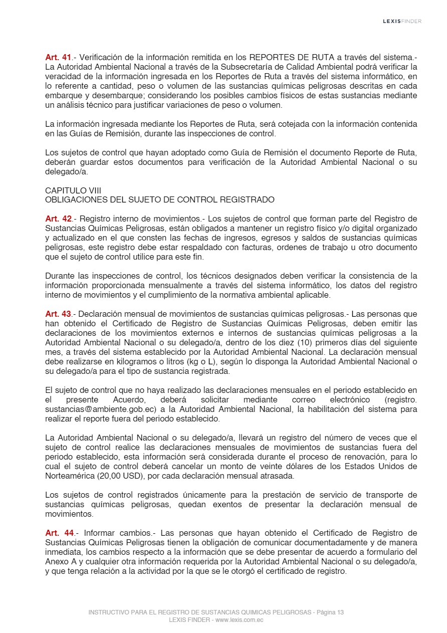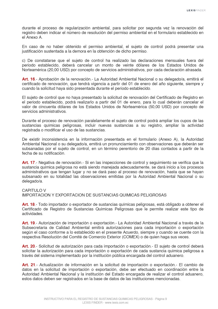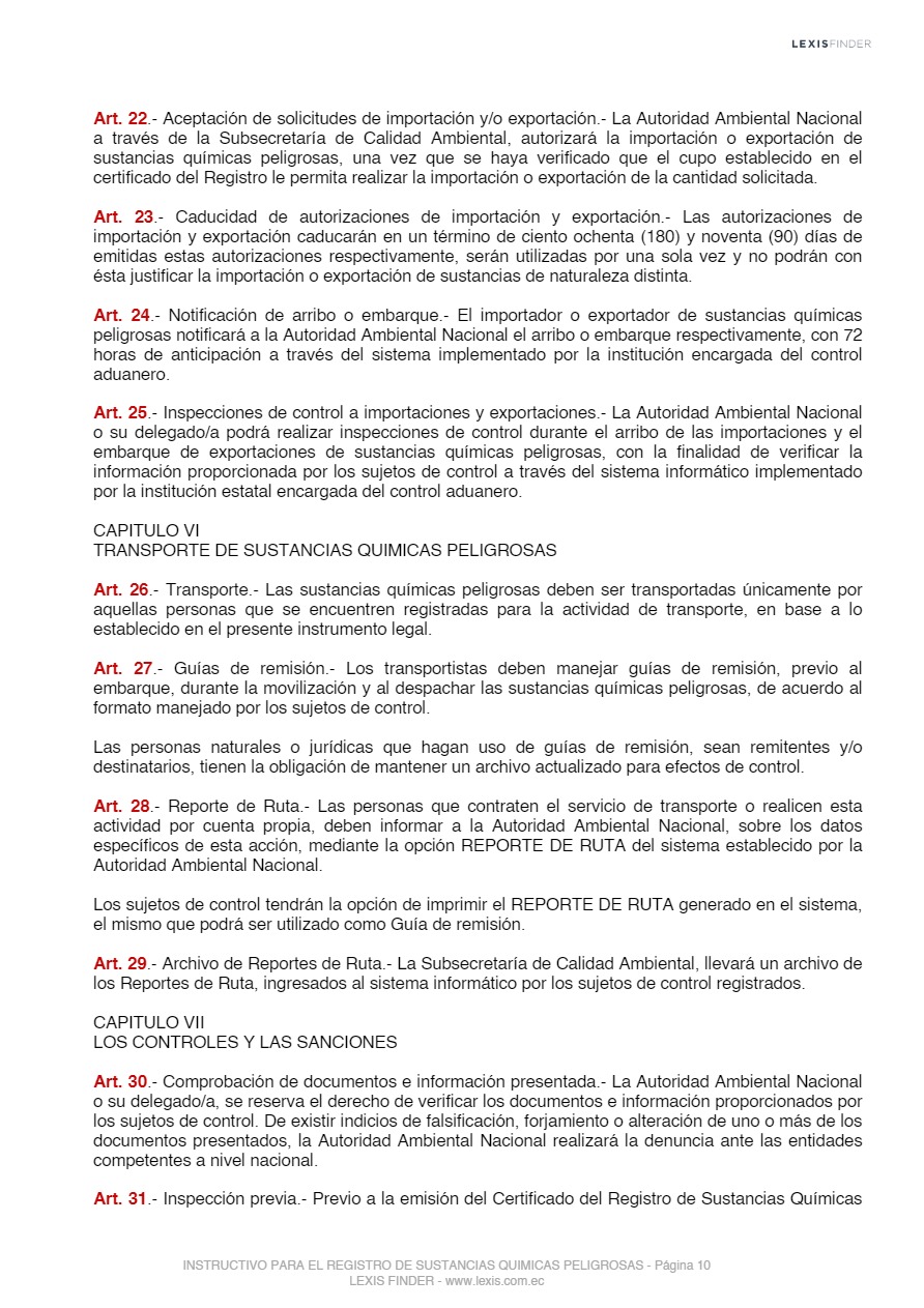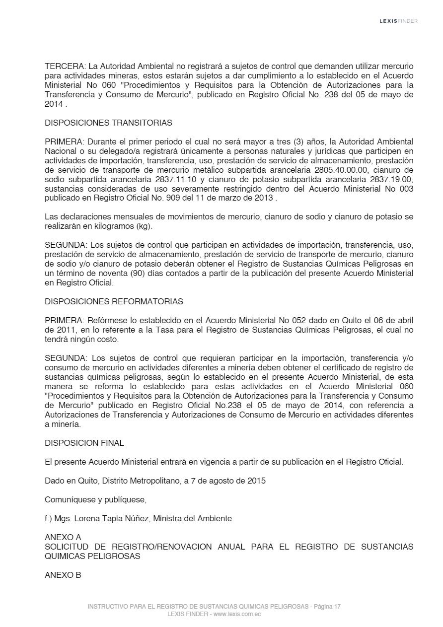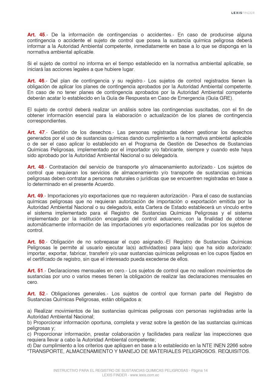 Las sustancias químicas peligrosas, cualquiera sea su forma, presentación o denominación que estarán sujetas a regulación y control mediante el presente instrumento, son las que la Autoridad Ambiental Nacional incorpore progresivamente al registro posterior a un análisis de los impactos producidos por el uso de éstas, las mismas que serán tomadas de los listados nacionales de sustancias químicas peligrosas de toxicidad aguda, toxicidad crónica y de uso restringido y los tratados o convenios internacionales de los cuales el Ecuador sea miembro suscriptor o adherente.