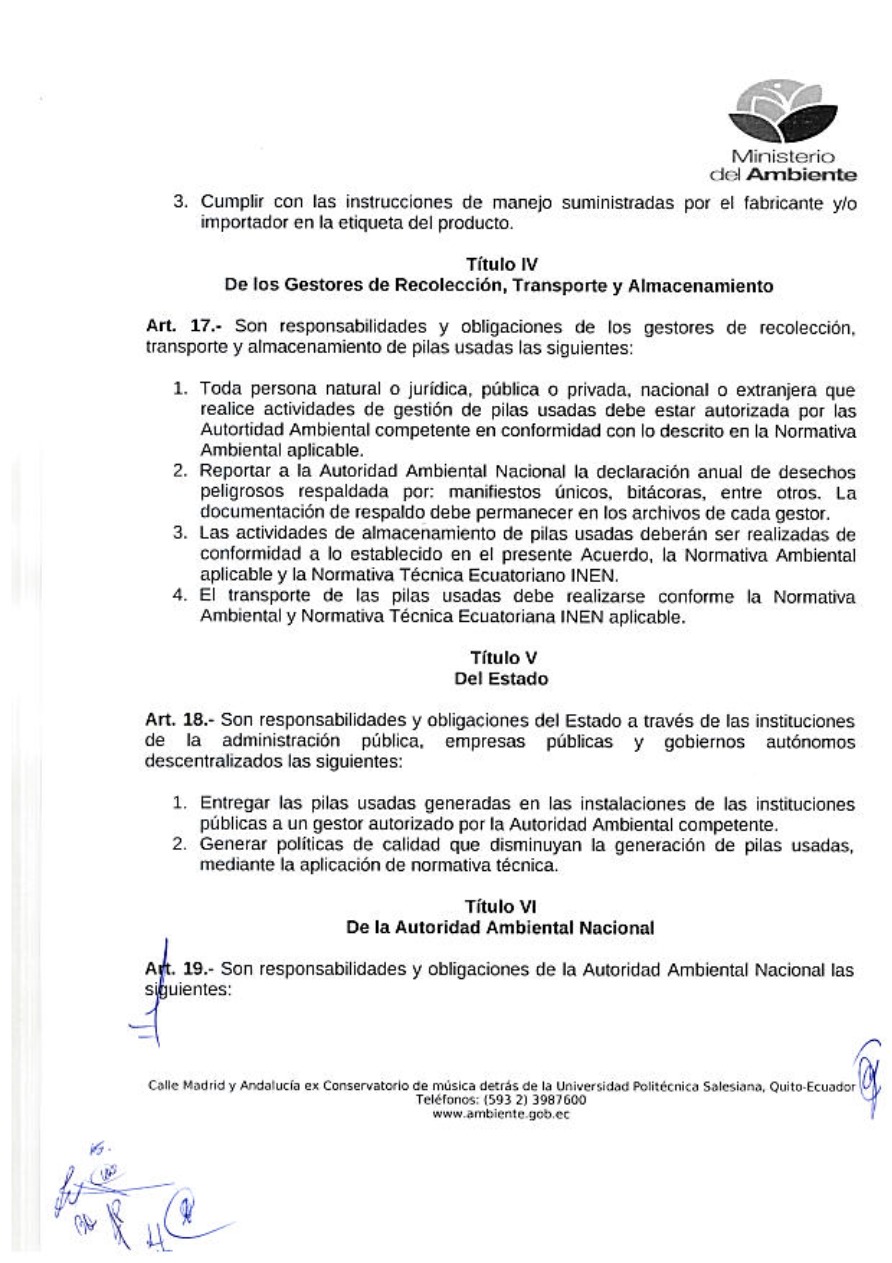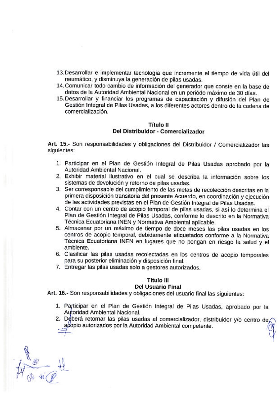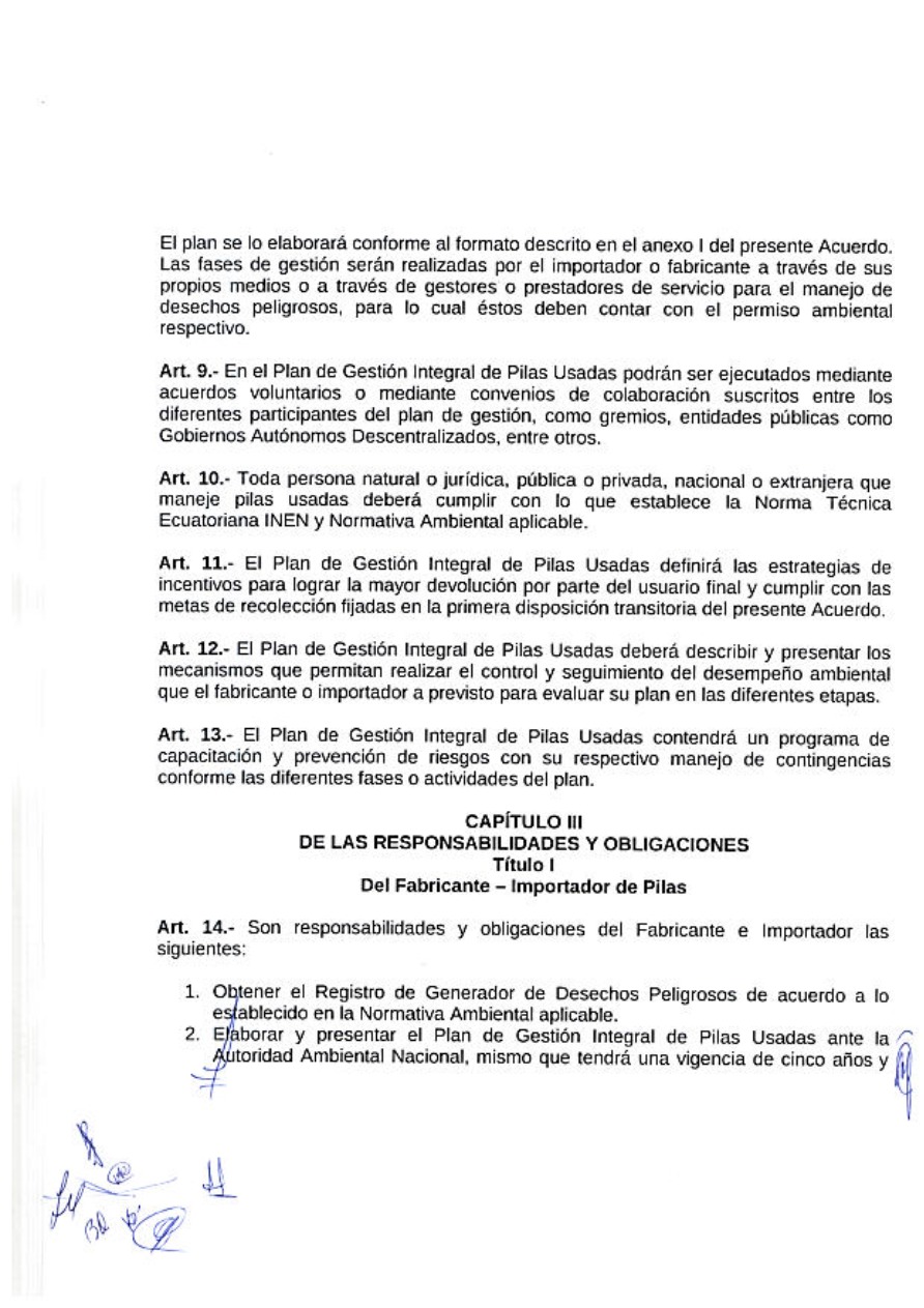 Toda persona natural o jurídica, pública o privada, nacional o extranjera que dentro del territorio nacional participen en la fabricación, importación, siendo la comercialización, distribución y uso final corresponsables de la implementación y ejecución de los planes de gestión integral de pilas usadas.