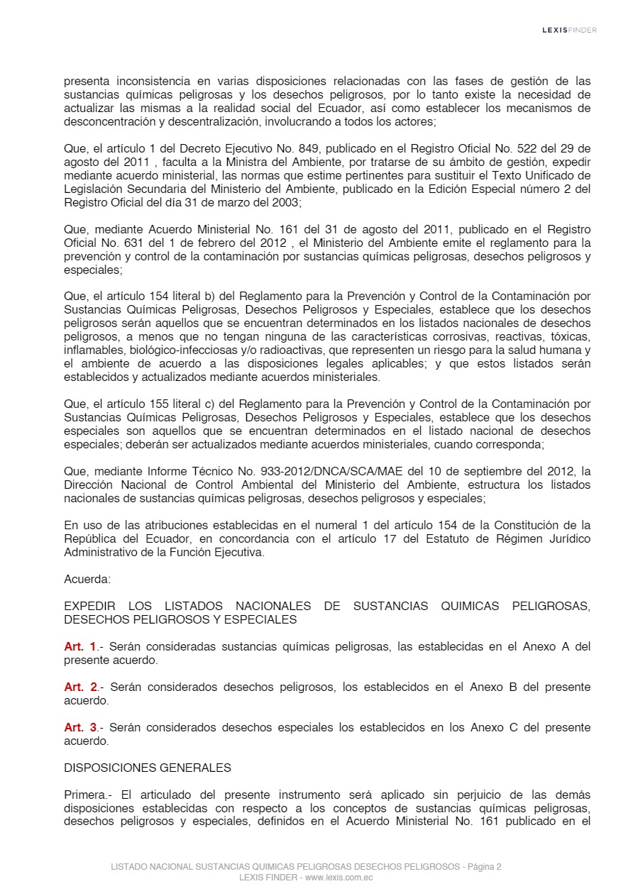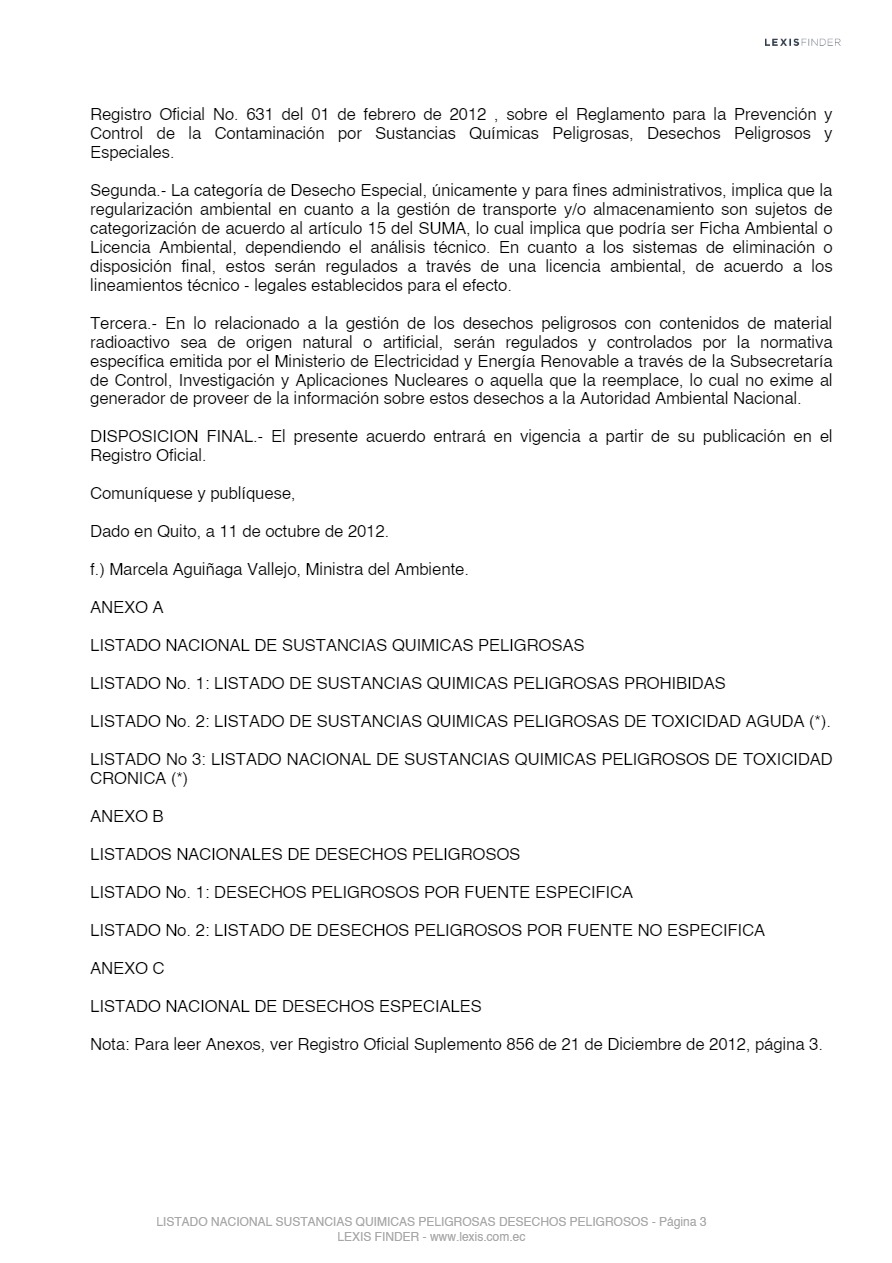 Los listados nacionales de sustancias químicas peligrosas, desechos peligrosos y especiales.