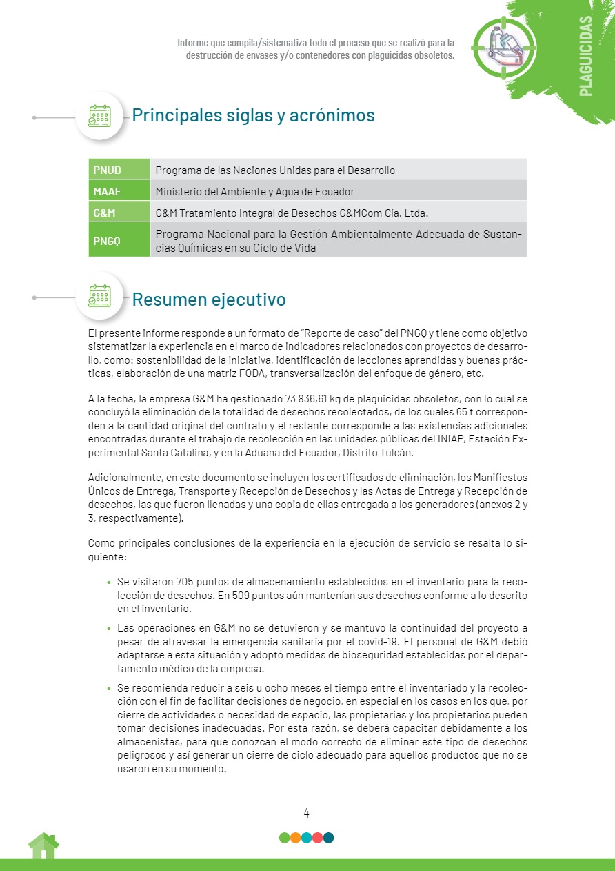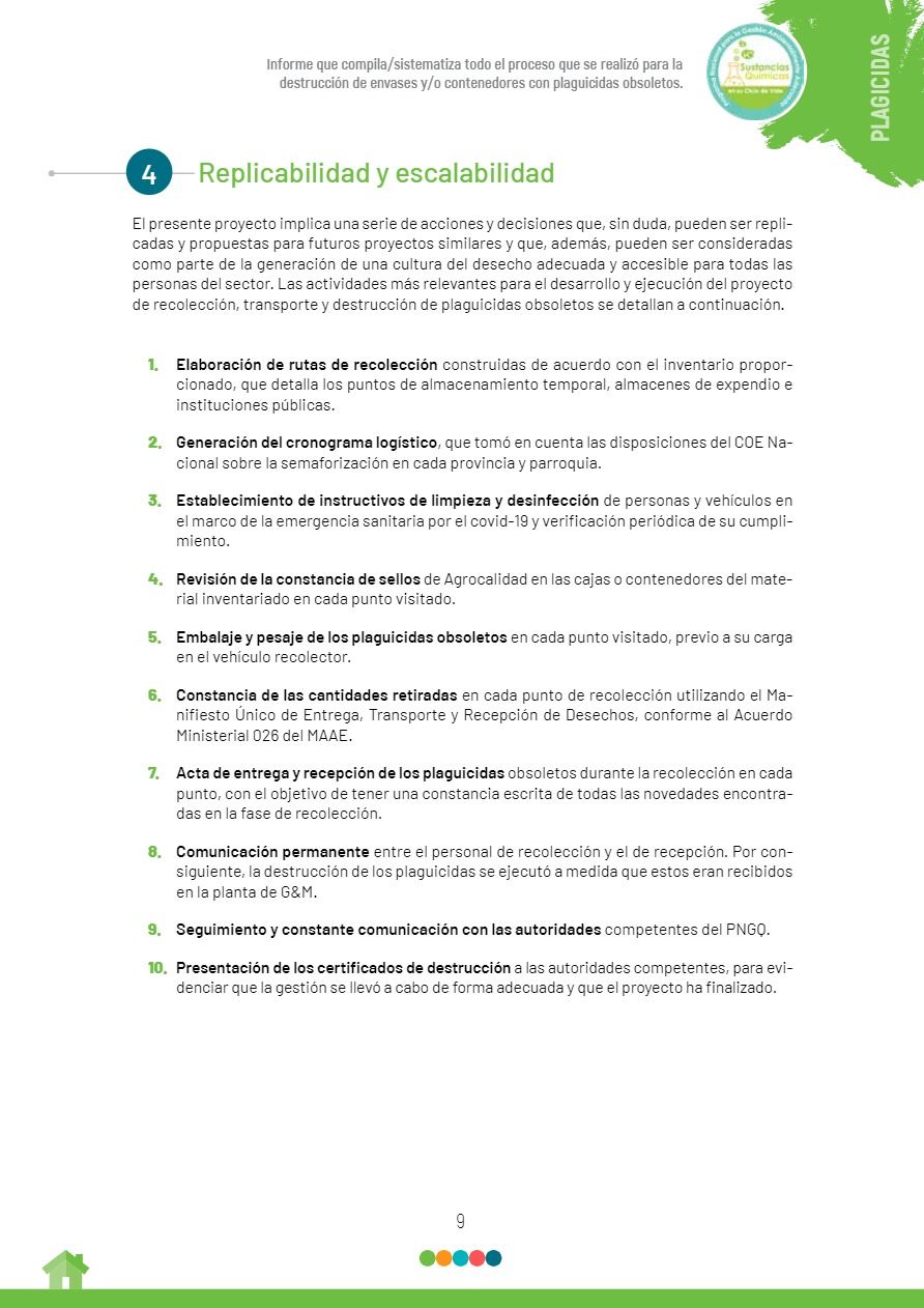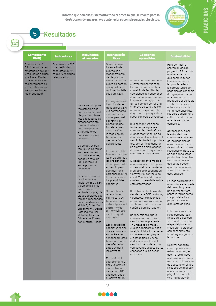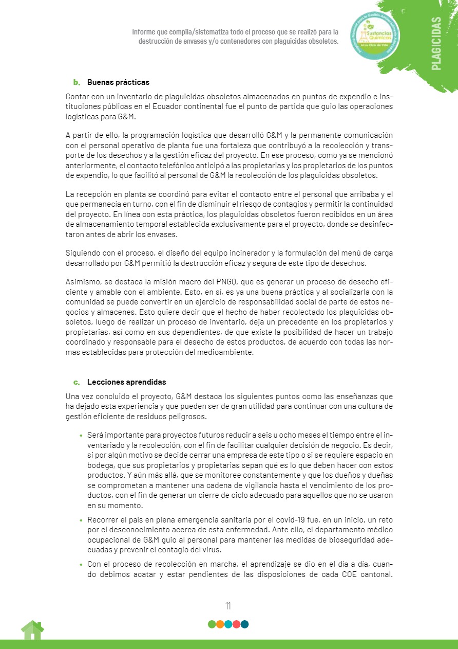 Documento que describe la segunda fase de eliminación de 73 toneladas de plaguicidas obsoletos realizada en el año 2020 por parte del PNGQ