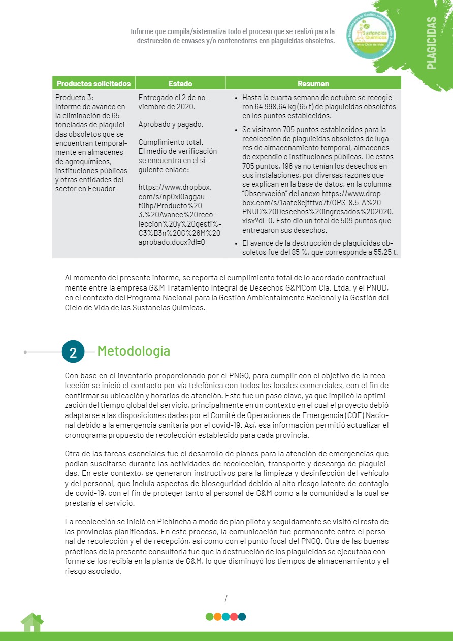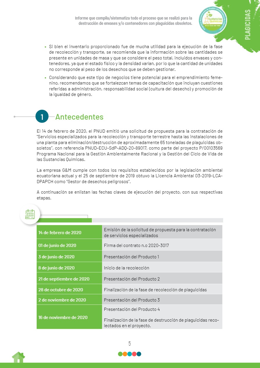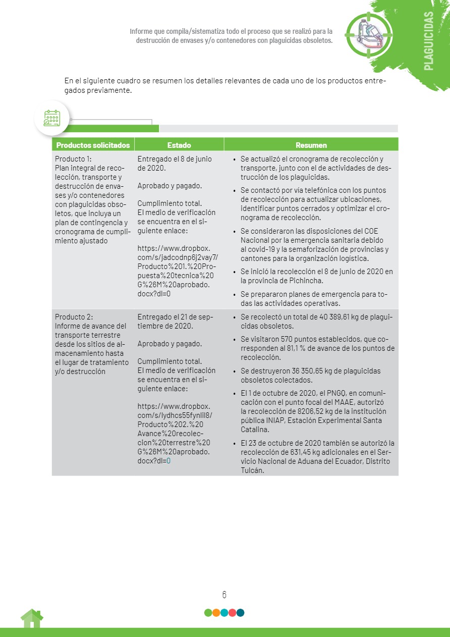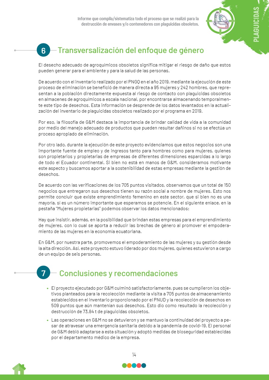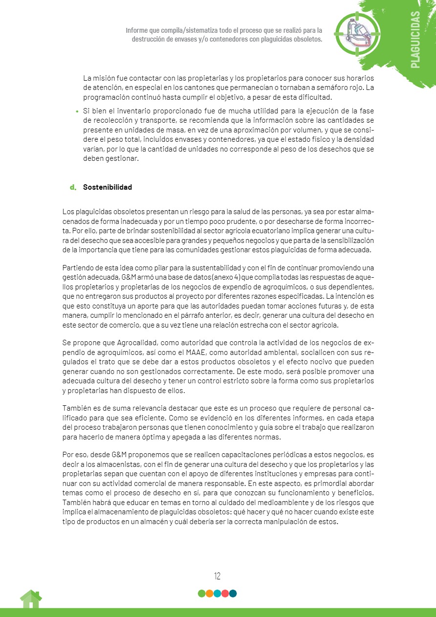 Documento que describe la segunda fase de eliminación de 73 toneladas de plaguicidas obsoletos realizada en el año 2020 por parte del PNGQ