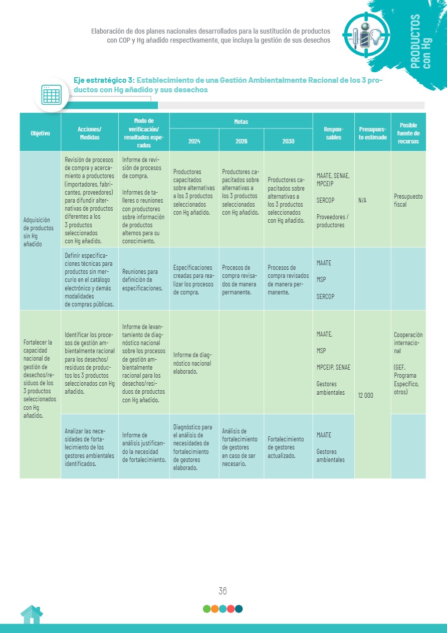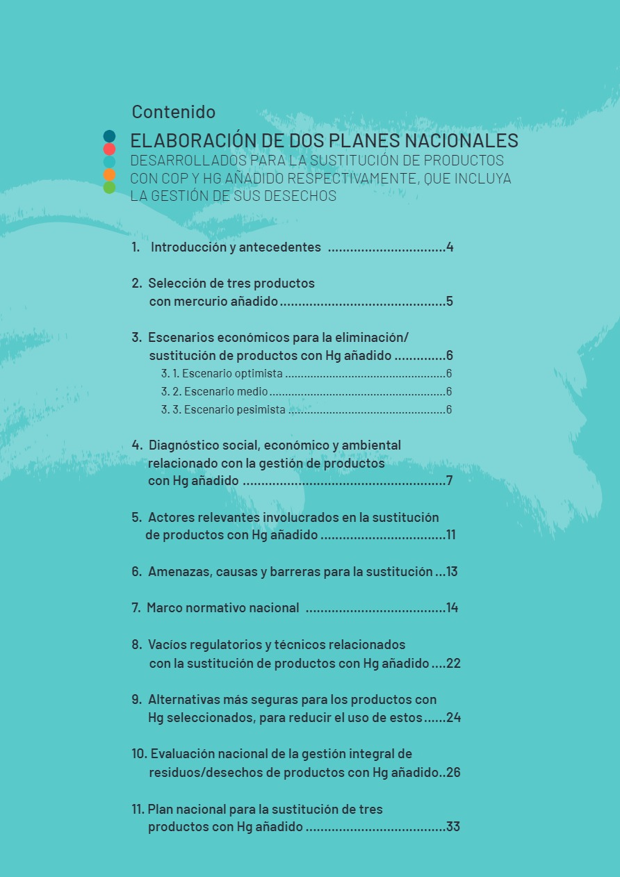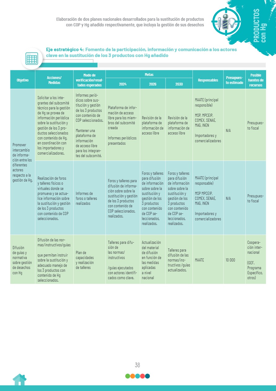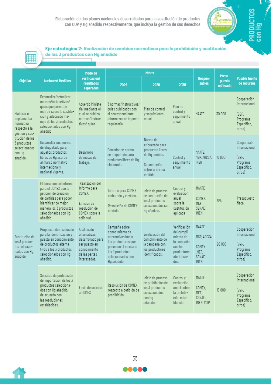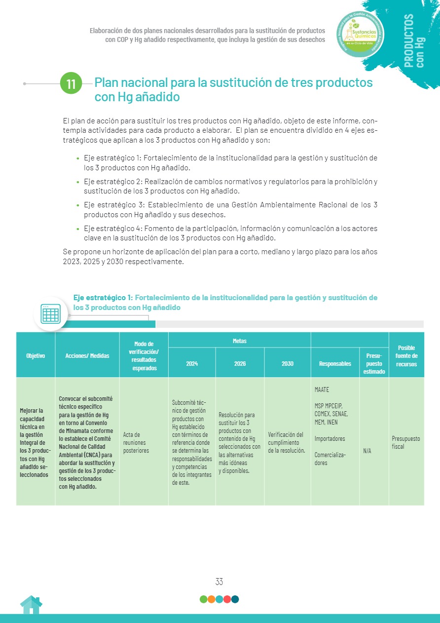 Desarrollo de acciones que permitan abordar la sustitución progresiva de los 3 productos con Hg añadido. El plan comprende 4 ejes estratégicos: fortalecimiento institucional, procedimientos o cambios administrativos y arancelarios, establecimiento de una gestión ambiental adecuada, plan de comunicación y difusión de información a los actores clave y ciudadanía en general.