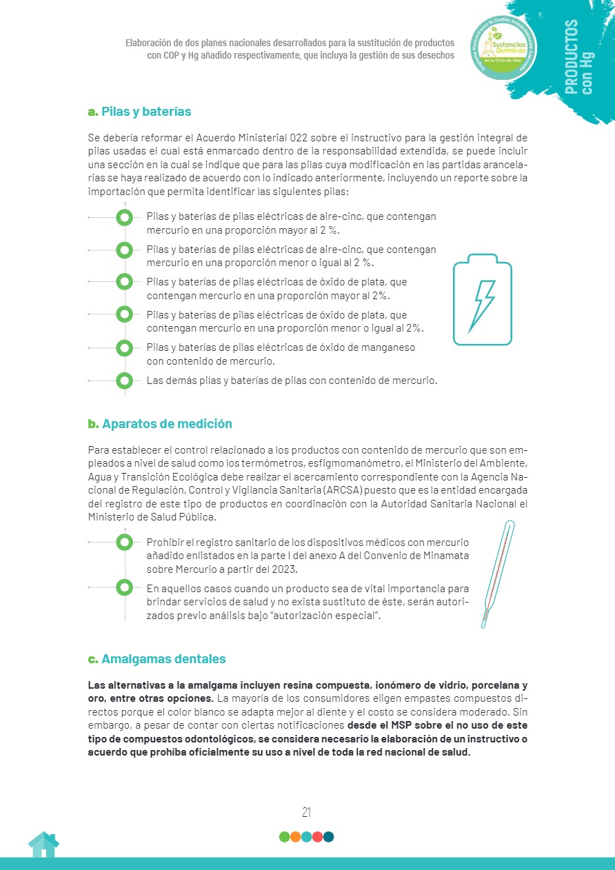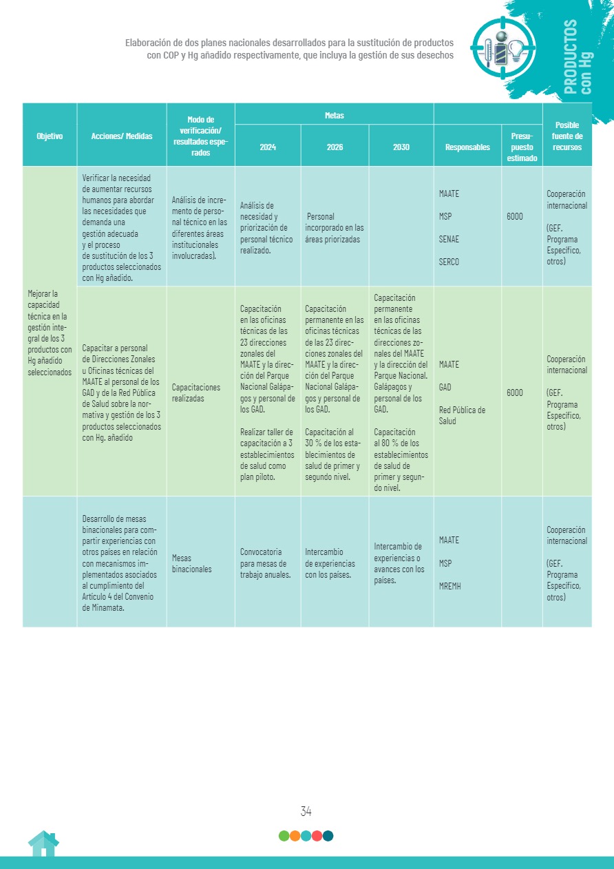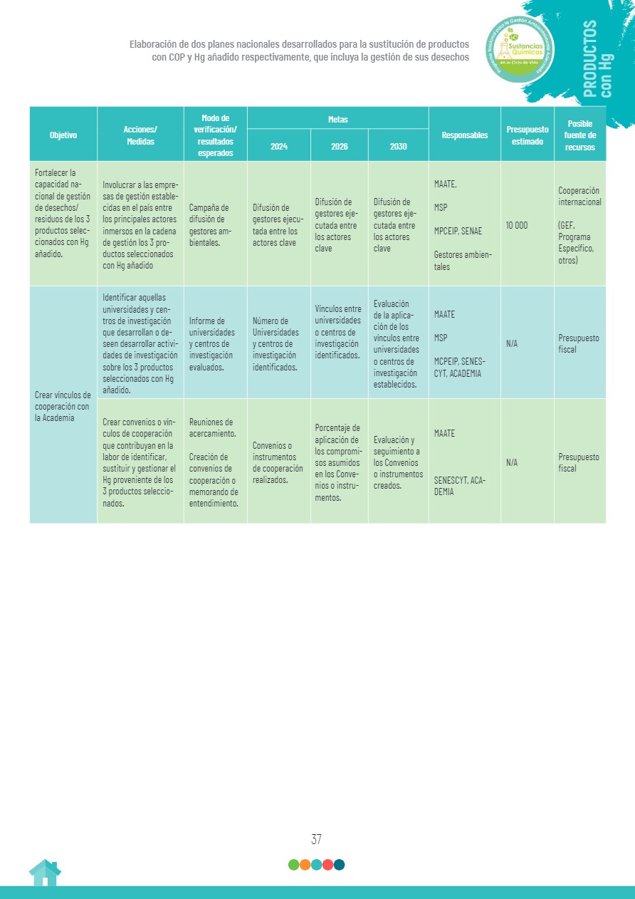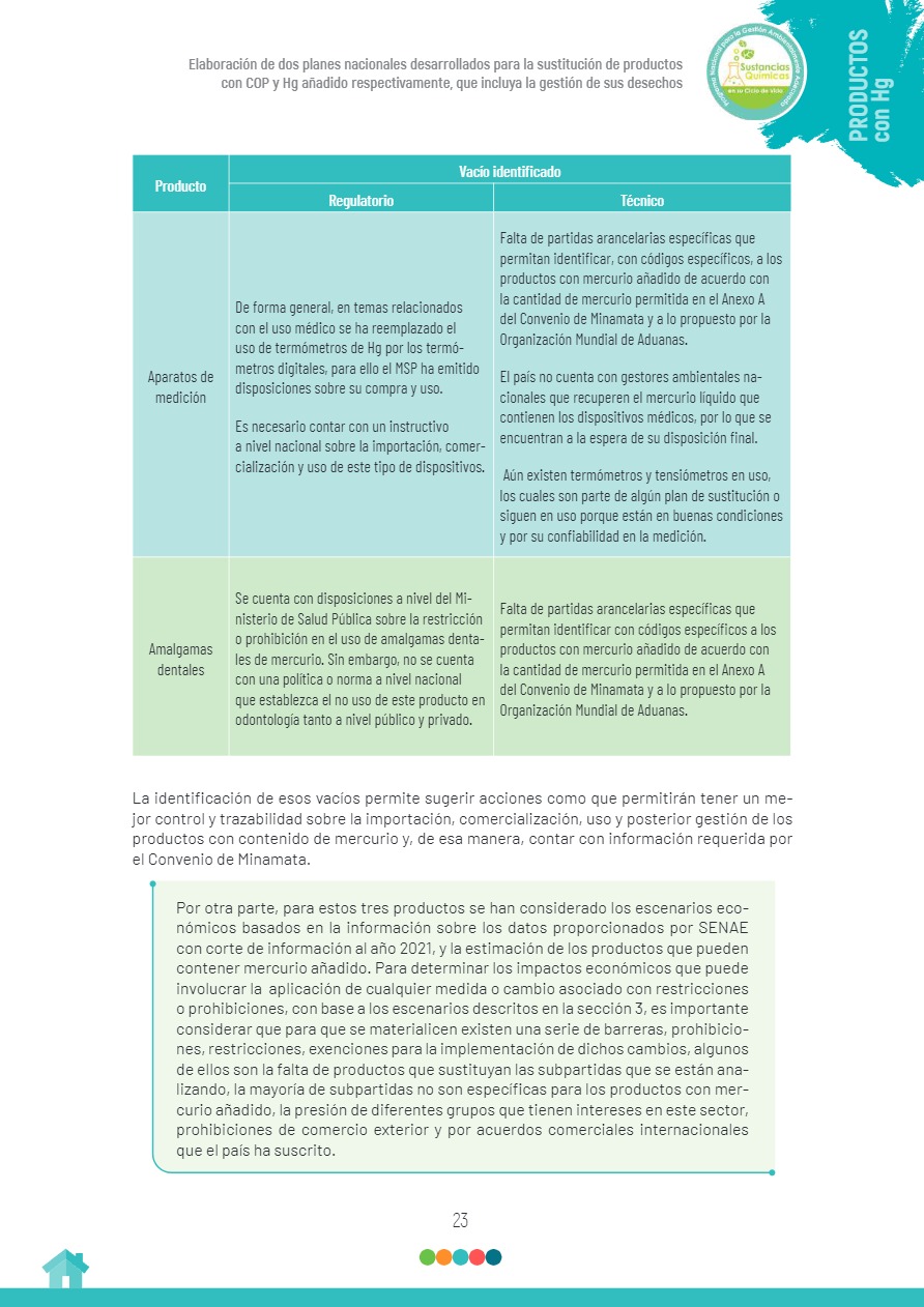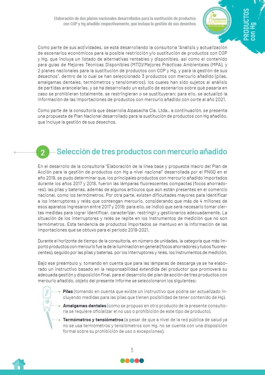 Desarrollo de acciones que permitan abordar la sustitución progresiva de los 3 productos con Hg añadido. El plan comprende 4 ejes estratégicos: fortalecimiento institucional, procedimientos o cambios administrativos y arancelarios, establecimiento de una gestión ambiental adecuada, plan de comunicación y difusión de información a los actores clave y ciudadanía en general.