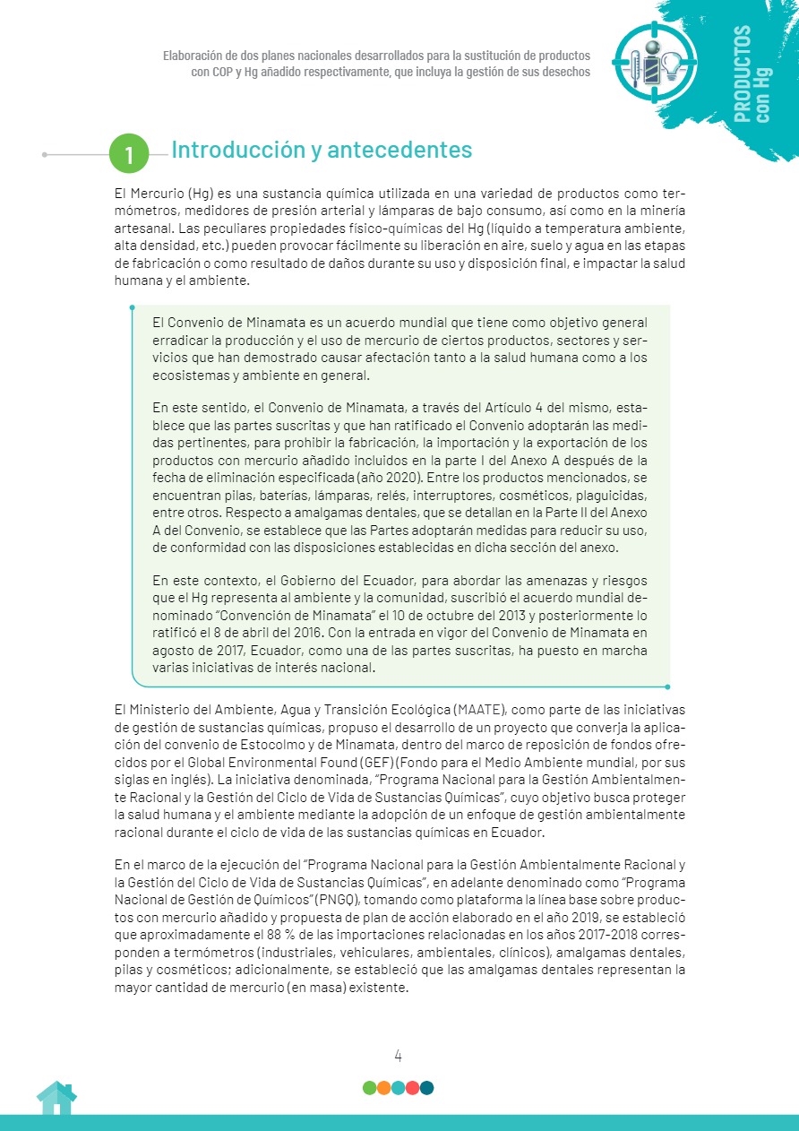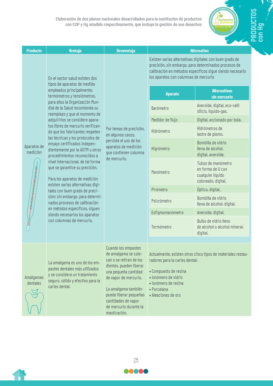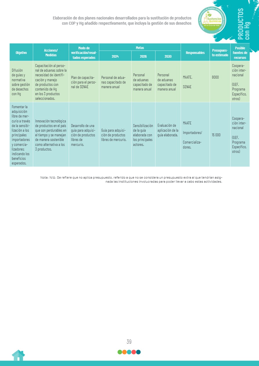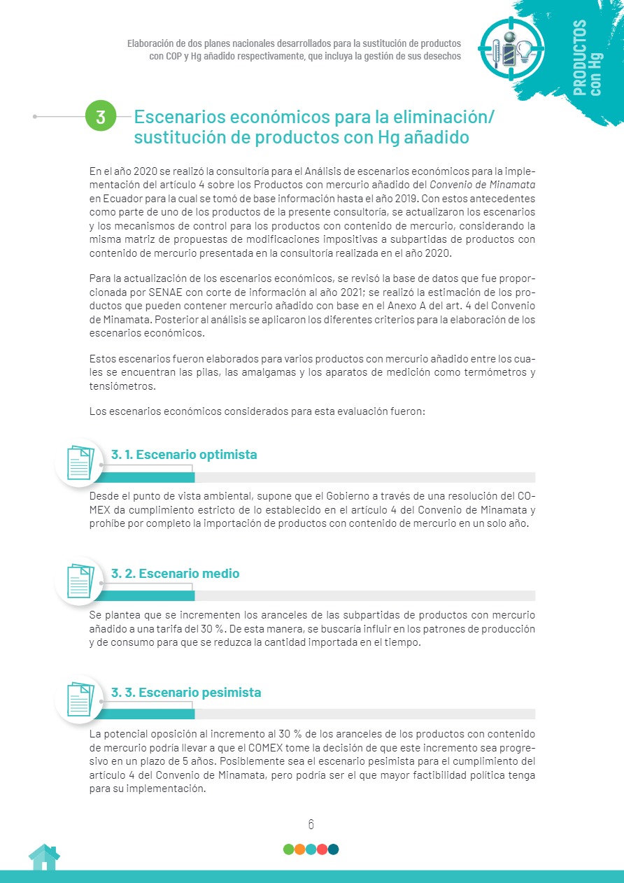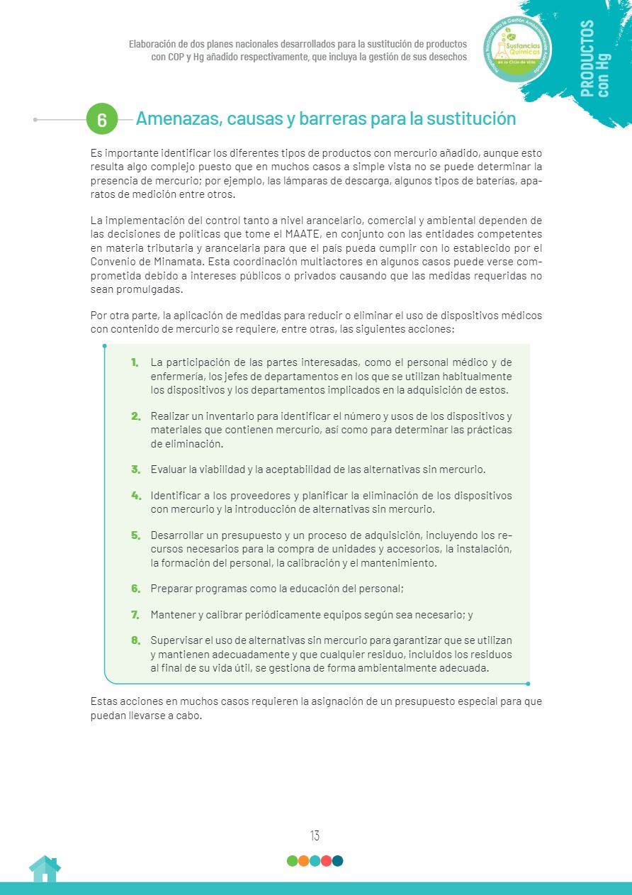 Desarrollo de acciones que permitan abordar la sustitución progresiva de los 3 productos con Hg añadido. El plan comprende 4 ejes estratégicos: fortalecimiento institucional, procedimientos o cambios administrativos y arancelarios, establecimiento de una gestión ambiental adecuada, plan de comunicación y difusión de información a los actores clave y ciudadanía en general.