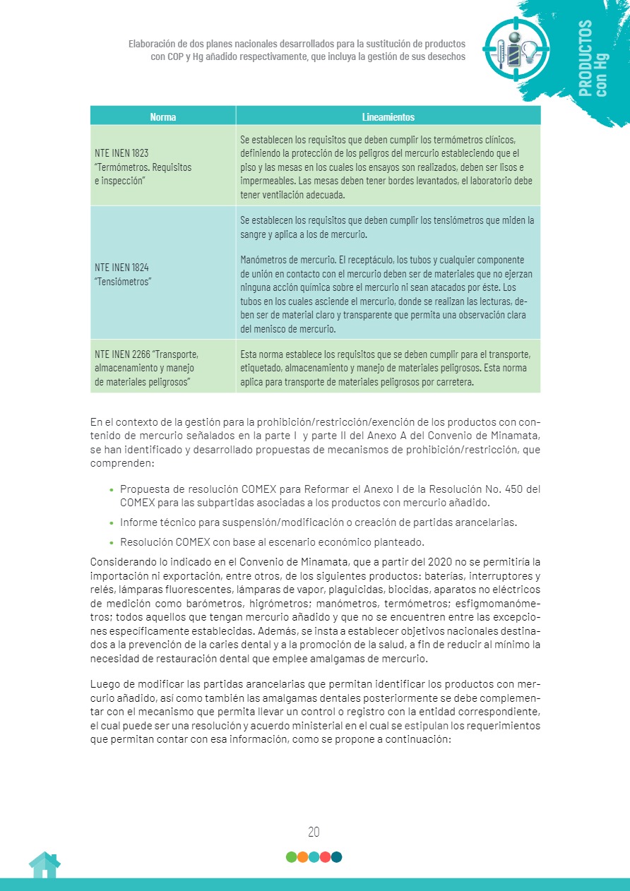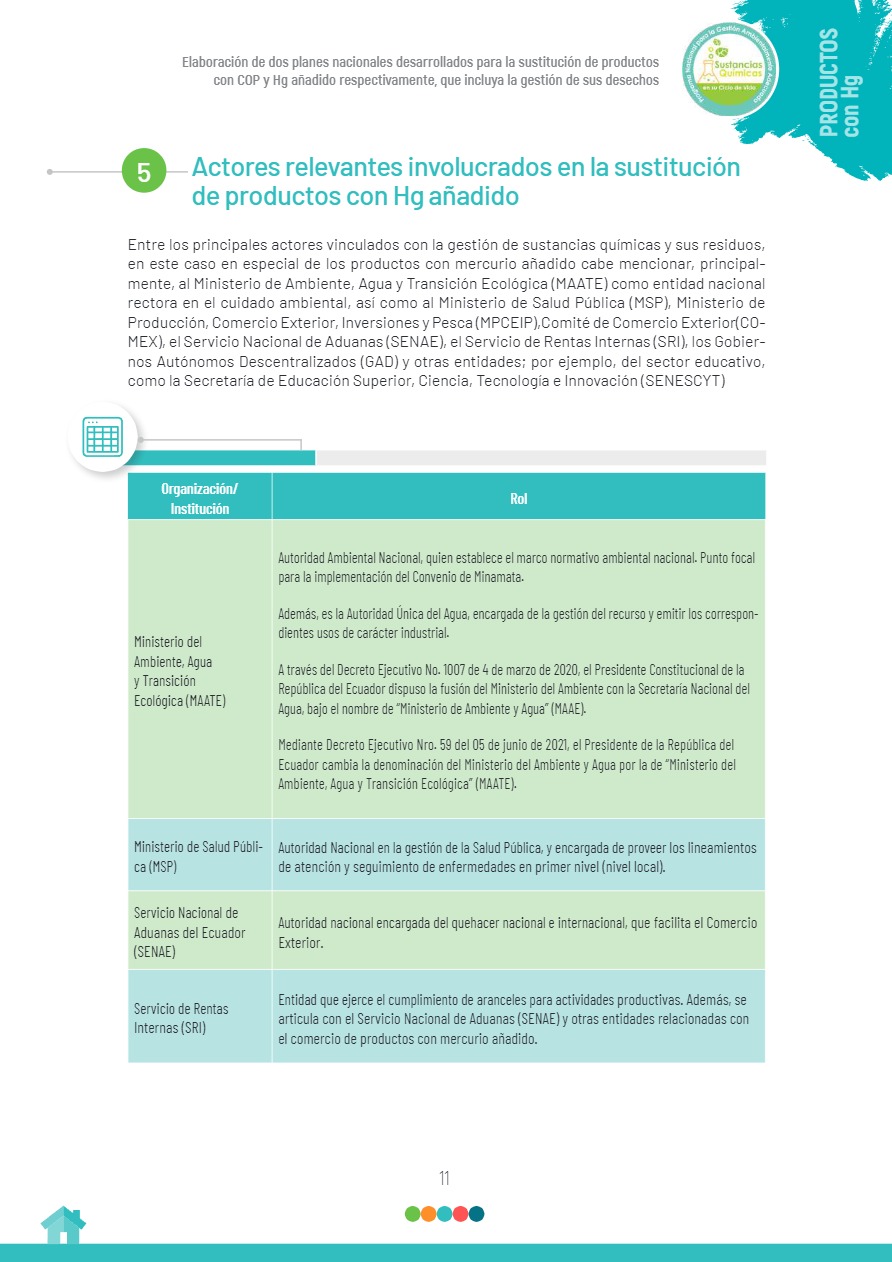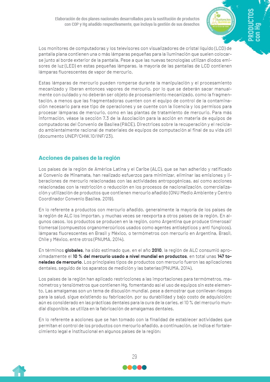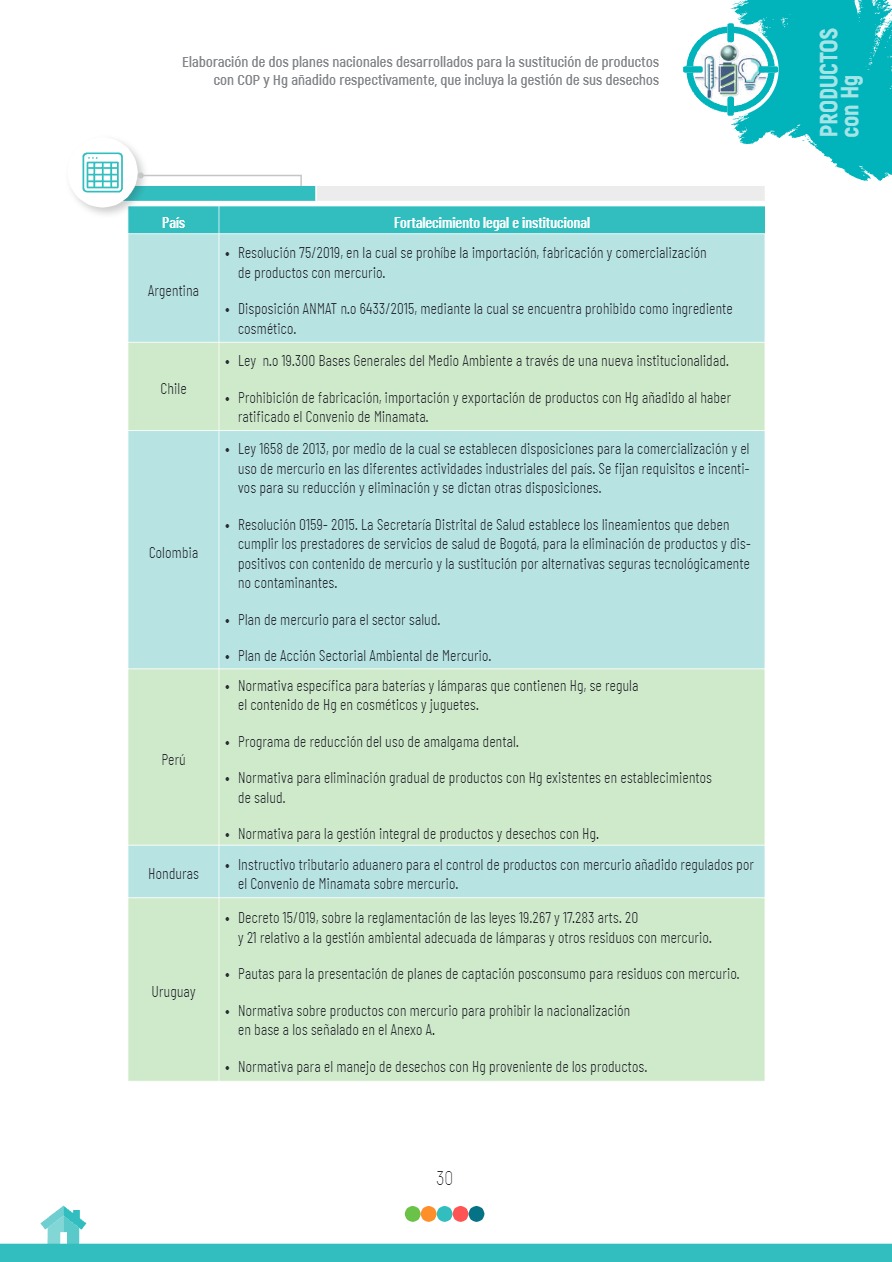 Desarrollo de acciones que permitan abordar la sustitución progresiva de los 3 productos con Hg añadido. El plan comprende 4 ejes estratégicos: fortalecimiento institucional, procedimientos o cambios administrativos y arancelarios, establecimiento de una gestión ambiental adecuada, plan de comunicación y difusión de información a los actores clave y ciudadanía en general.