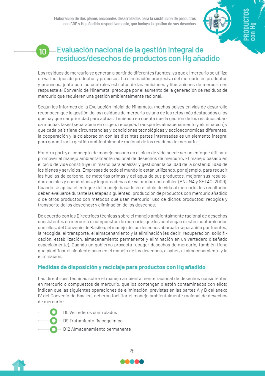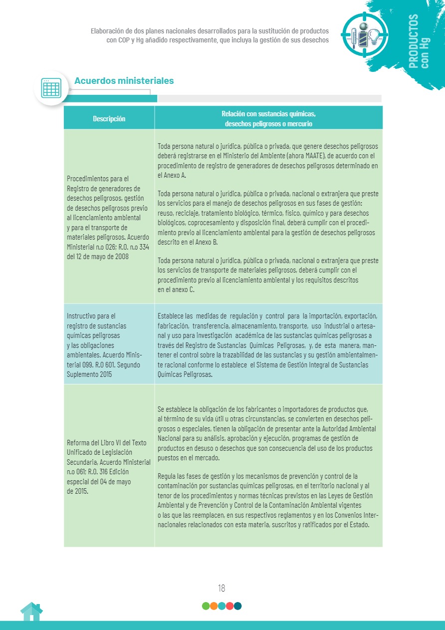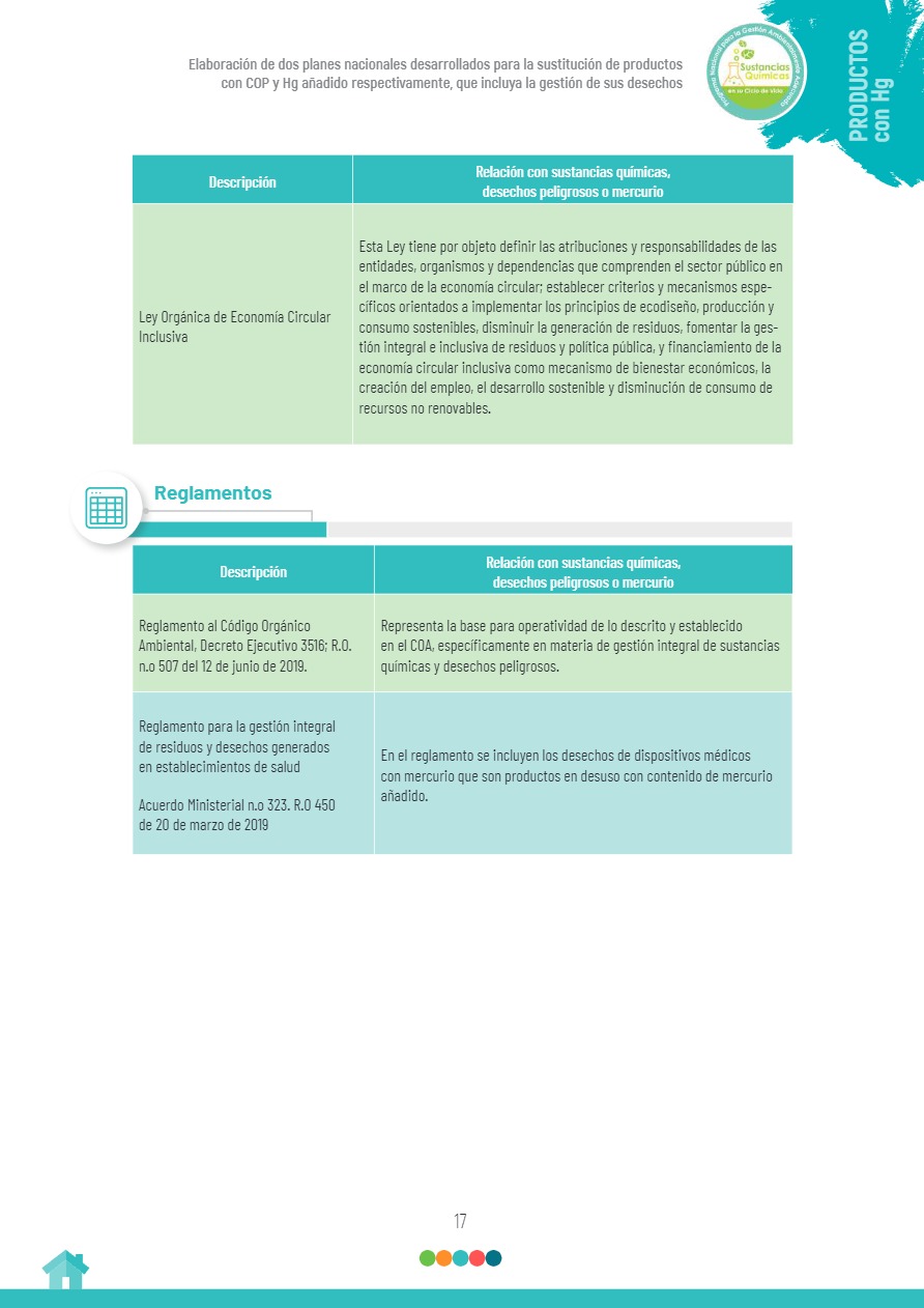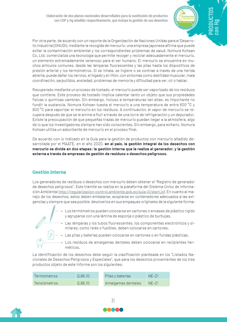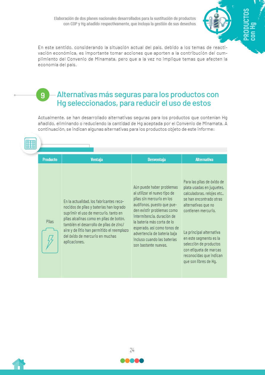Desarrollo de acciones que permitan abordar la sustitución progresiva de los 3 productos con Hg añadido. El plan comprende 4 ejes estratégicos: fortalecimiento institucional, procedimientos o cambios administrativos y arancelarios, establecimiento de una gestión ambiental adecuada, plan de comunicación y difusión de información a los actores clave y ciudadanía en general.