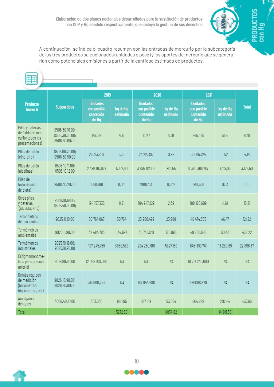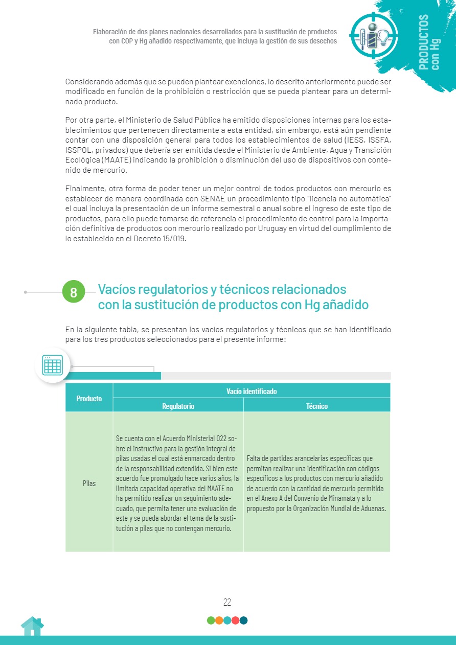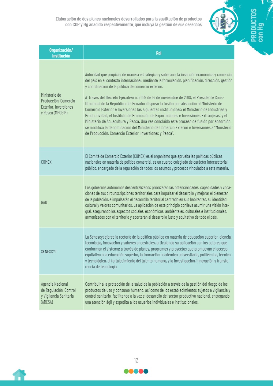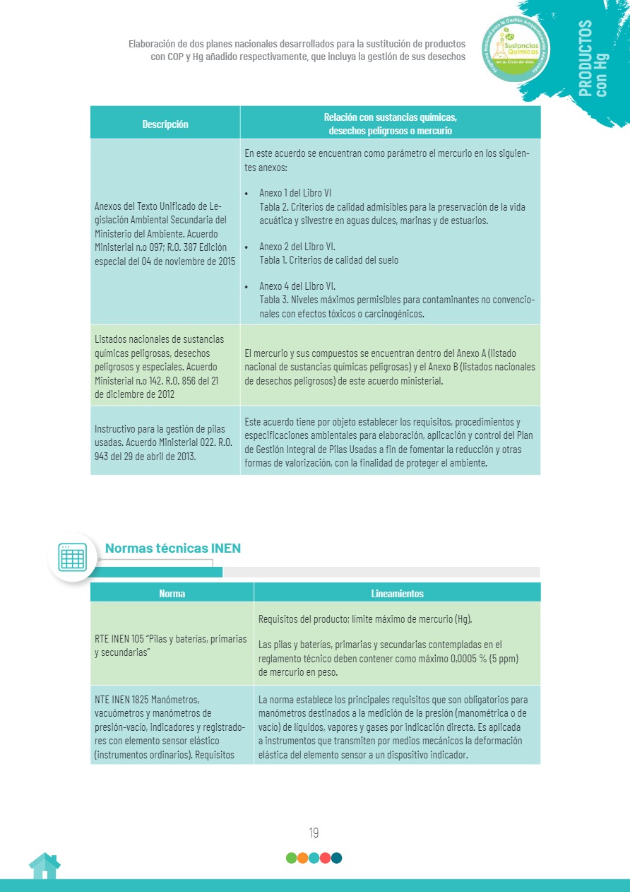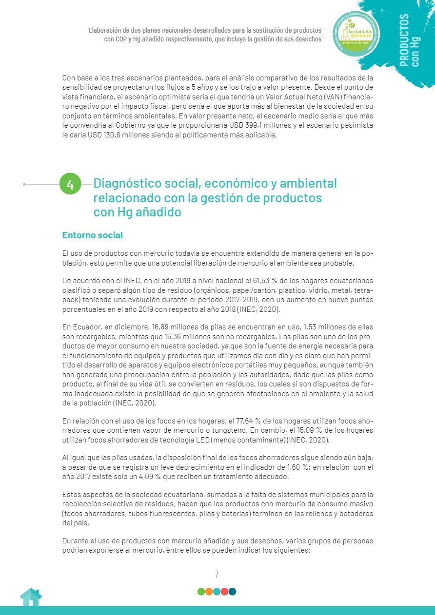 Desarrollo de acciones que permitan abordar la sustitución progresiva de los 3 productos con Hg añadido. El plan comprende 4 ejes estratégicos: fortalecimiento institucional, procedimientos o cambios administrativos y arancelarios, establecimiento de una gestión ambiental adecuada, plan de comunicación y difusión de información a los actores clave y ciudadanía en general.