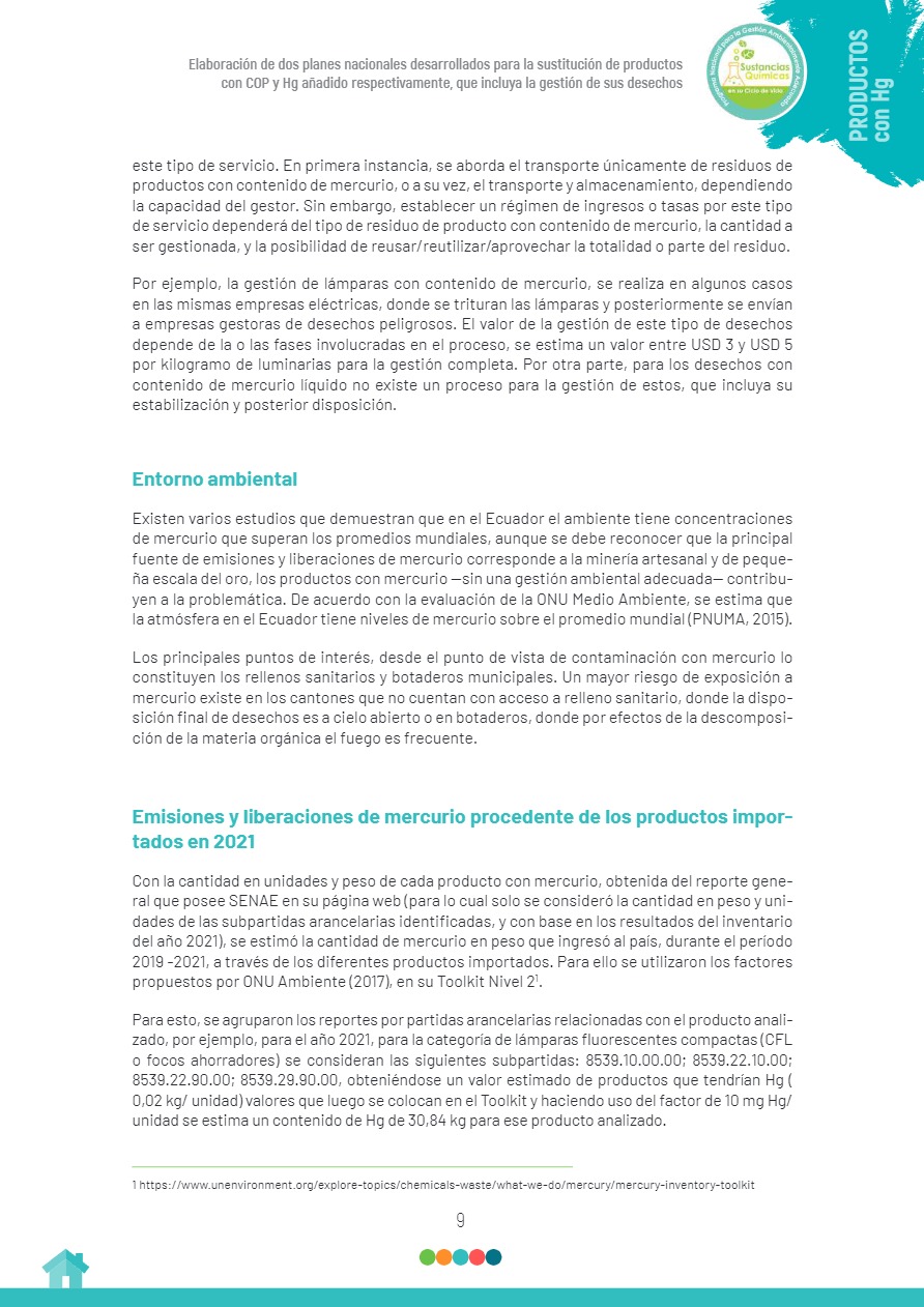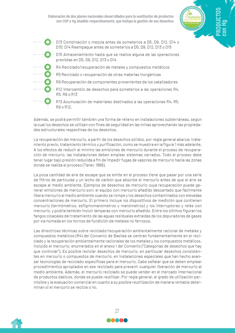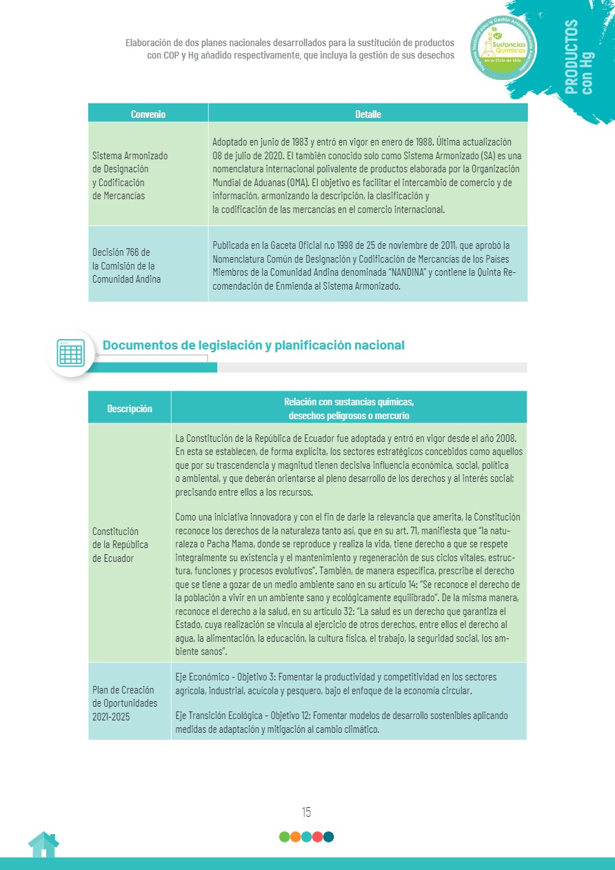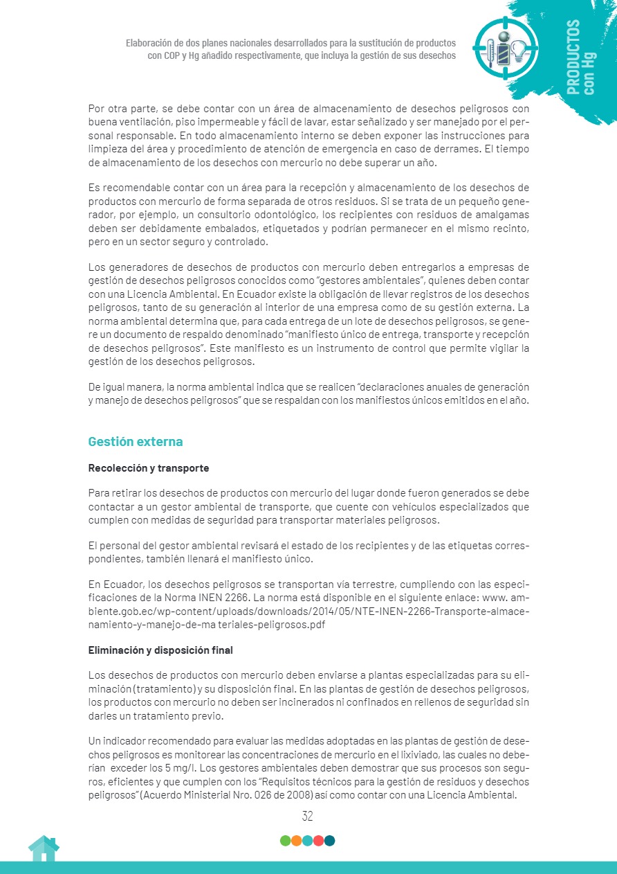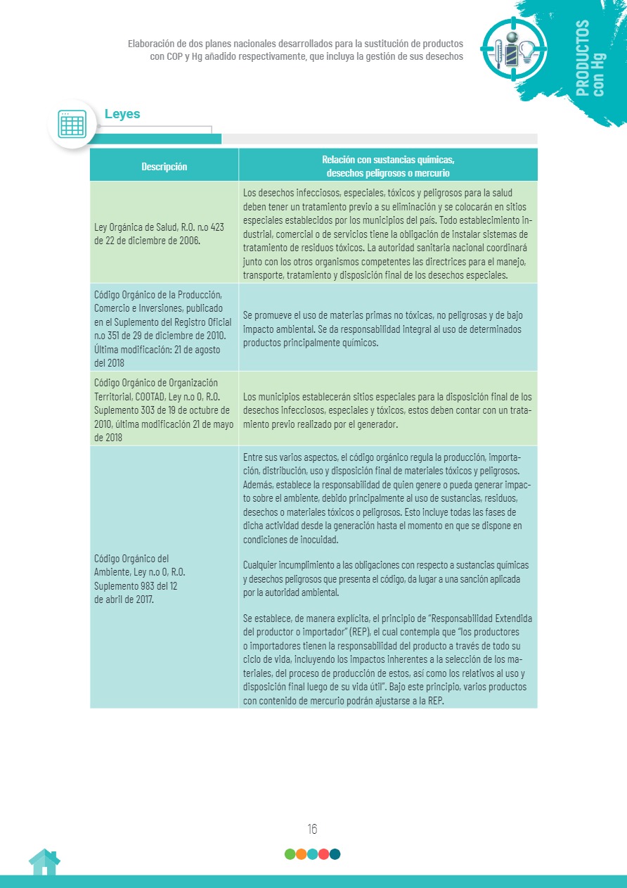 Desarrollo de acciones que permitan abordar la sustitución progresiva de los 3 productos con Hg añadido. El plan comprende 4 ejes estratégicos: fortalecimiento institucional, procedimientos o cambios administrativos y arancelarios, establecimiento de una gestión ambiental adecuada, plan de comunicación y difusión de información a los actores clave y ciudadanía en general.
